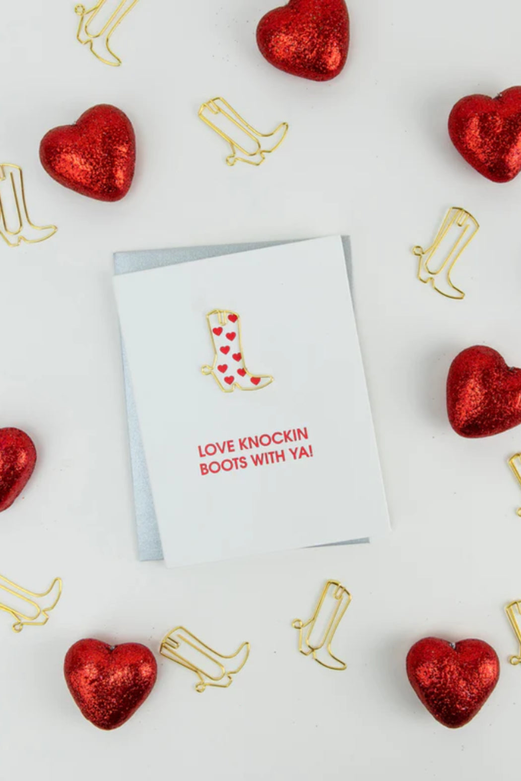 Our "Love Knockin' Boots With Ya" card is letterpress printed on a vintage printing press in sunny California. Card includes a heavy duty cowboy boot paper clip.