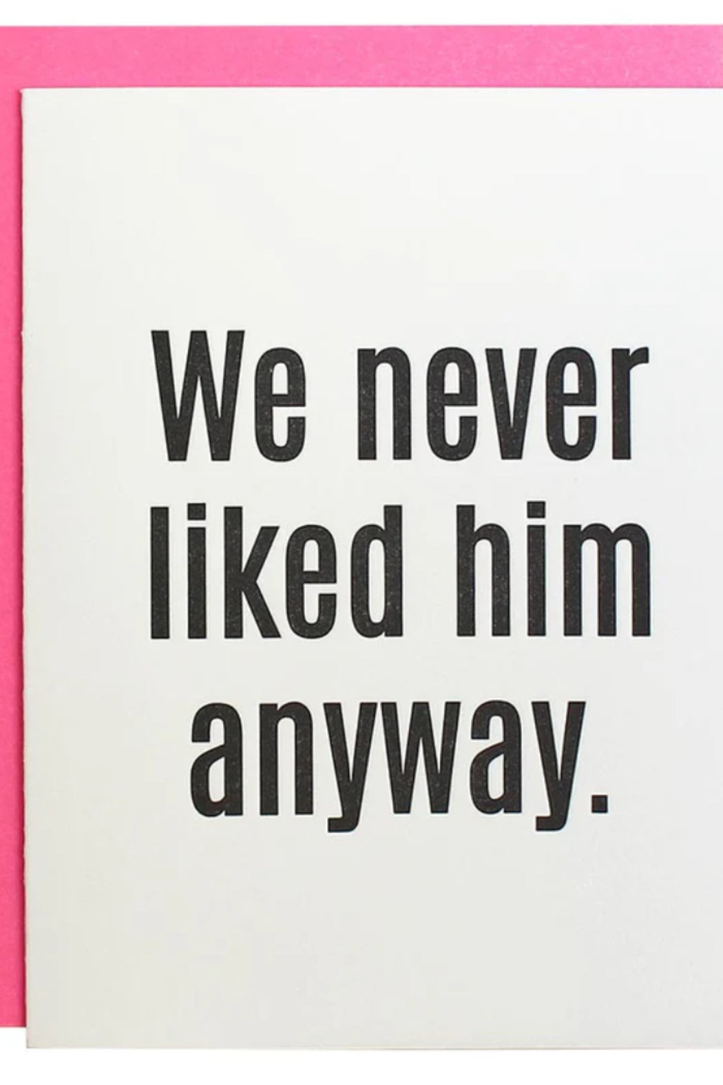 Our "We Never Liked Him Anyway" card is letterpress printed on a vintage printing press in sunny California.