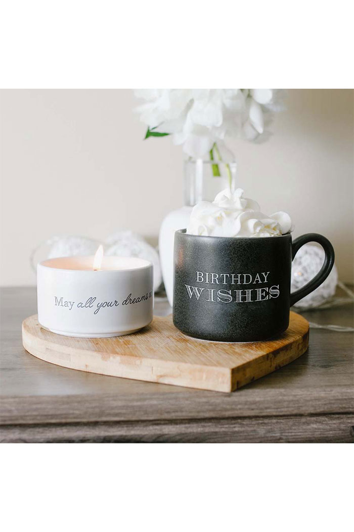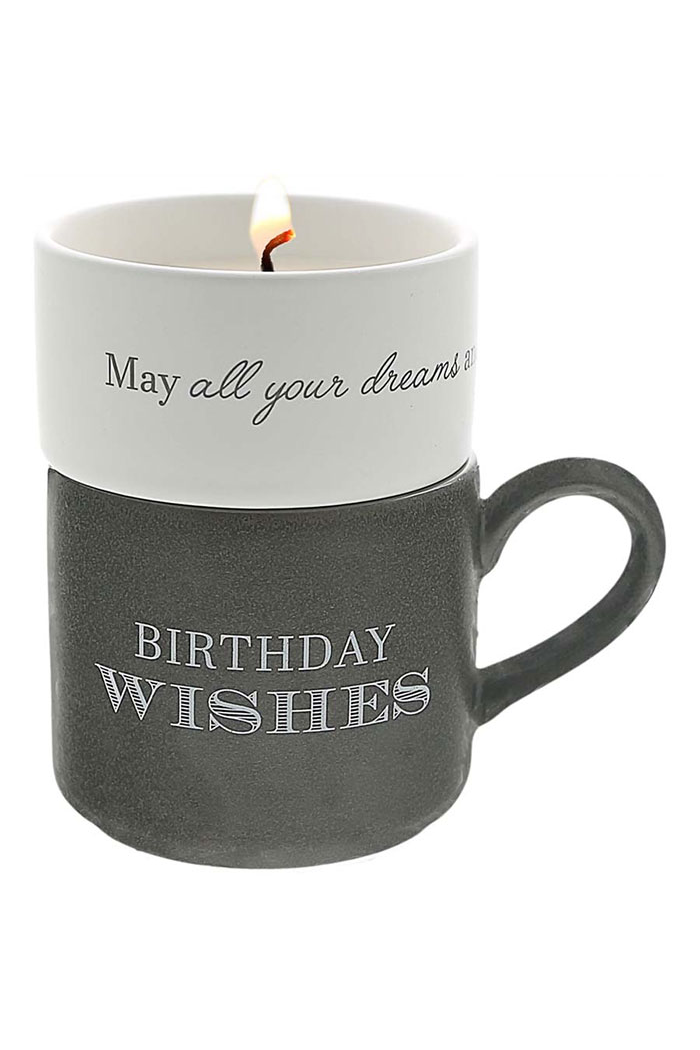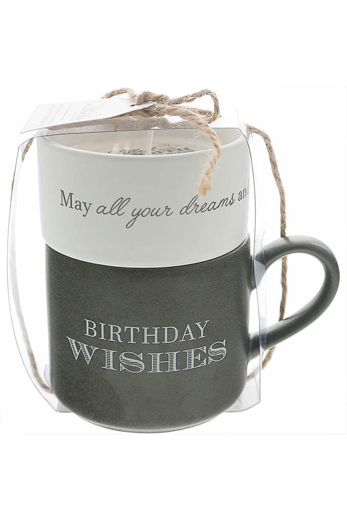 Birthday - Stacking Mug and Candle Set. 1.5" tall x 3.5" round gray speckled stoneware candle has a single 100% cotton lead and nickel-free wick with 4 oz of tranquility-scented soy wax. 11-12 hour burn time. The 5" long, 3" tall & 3.5" wide white matte exterior and gray glossy interior stoneware mug hold 11 oz of liquid. Wrap-around white sentiment on the candle, "May All Of Your Dreams And Wishes Come True." The gray mug sentiment "Birthday Wishes" on the front side of the mug only. Faces towards you in the right hand or outward in the left hand. Dishwasher and microwave safe.