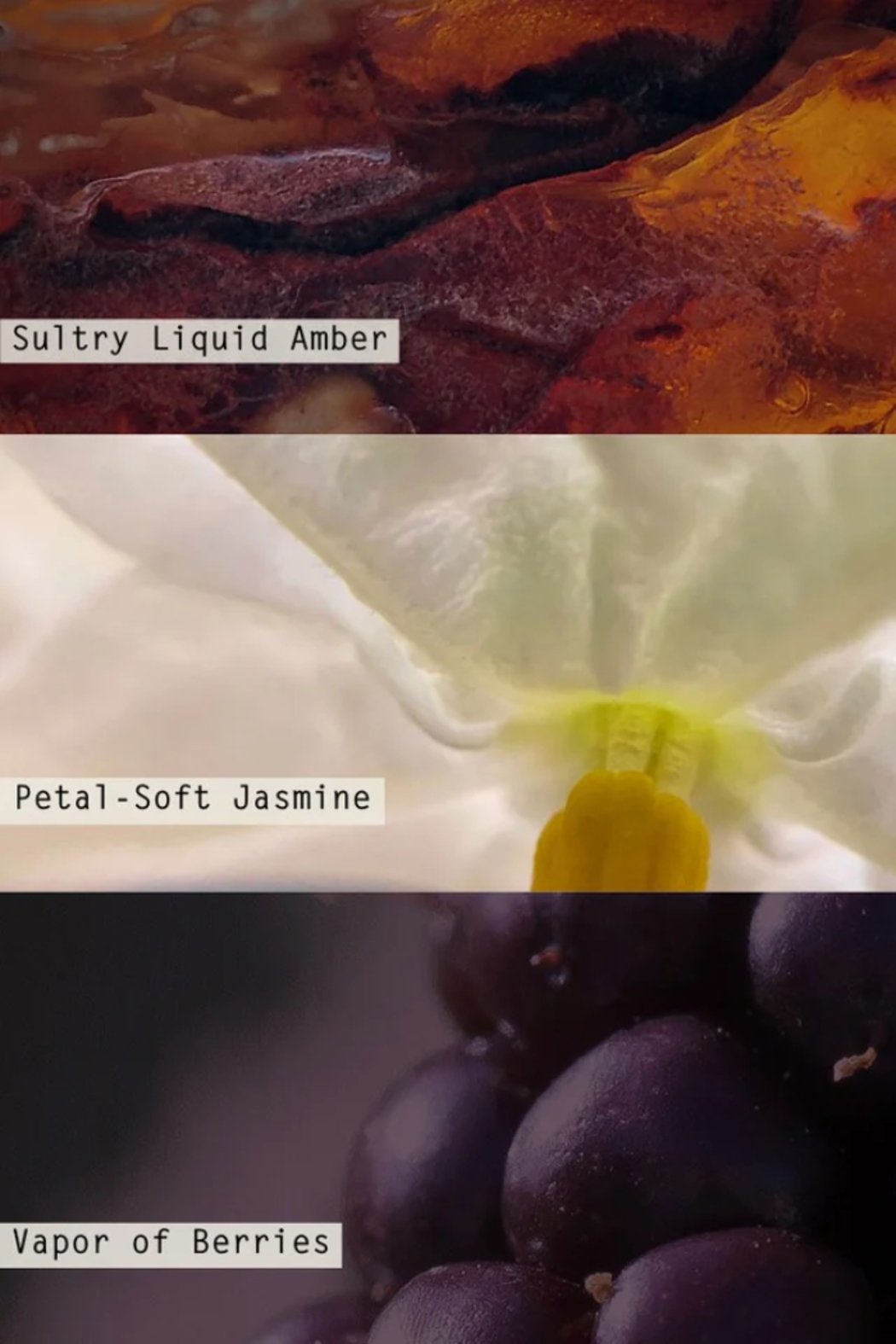 Grounded in sultry liquid amber, with a heart of petal-soft jasmine, and kissed with a vapor of berries.