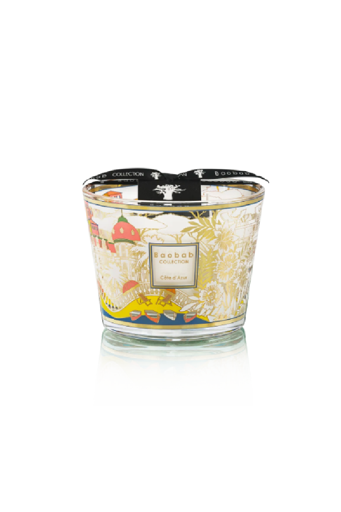 The screen-printed decor for the Côte d’Azur candle was inspired by some of the elements in Thierry Larcher’s design, such as the Negresco and the legendary Promenade des Anglais. We wanted to go a step further by incorporating architectural elements from the town of Menton and the town of Saint-Tropez. In the hinterland, you can imagine forests of umbrella pines and dream of visiting the Maeght Foundation in the heights of Saint-Paul-de-Vence.