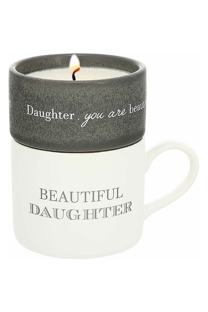 Daughter - Stacking Mug and Candle Set. 1.5" tall x 3.5" round gray speckled stoneware candle has a single 100% cotton lead and nickel-free wick with 4 oz of tranquility-scented soy wax. 11-12 hour burn time. The 5" long, 3" tall & 3.5" wide white matte exterior and gray glossy interior stoneware mug hold 11 oz of liquid. Wrap-around white sentiment on the candle, "Daughter, You Are Beautiful Inside And Out... Love You With All My Heart." Gray mug sentiment "Beautiful Daughter" on the front side of the mug only. Faces towards you in the right hand or outward in the left hand. Dishwasher and microwave safe.