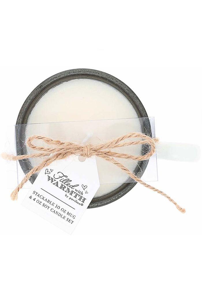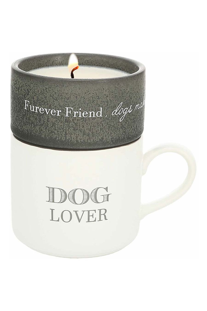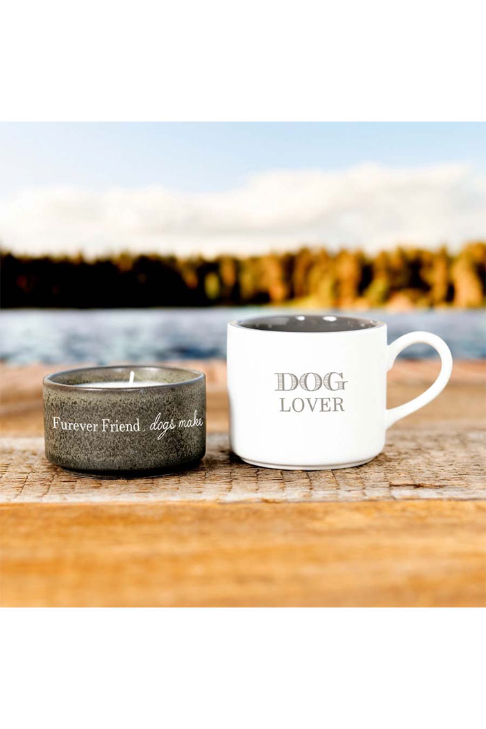 1.5" tall x 3.5" round gray speckled stoneware candle has a single 100% cotton lead and nickel-free wick with 4 oz of tranquility-scented soy wax. 11-12 hour burn time. The 5" long, 3" tall & 3.5" wide white matte exterior and gray glossy interior stoneware mug hold 11 oz of liquid. Wrap-around white sentiment on the candle, "Furever Friend, Dogs Make Everything Better.." Gray mug sentiment "Dog Lover" on the front side of the mug only. Faces towards you in the right hand or outward in the left hand. Dishwasher and microwave safe. Packaged with thin cardboard between each piece. Acetate band and twine to secure pieces in place with To. This excellent stackable set is a great mother's day gift for dog moms or a father's day gift for dog dads. After their candle has burned away, they can be washed out and used for holding small desk items such as paper clips, thumbtacks, or bathroom items like bobby pins, hair ties, toothpicks, and more.