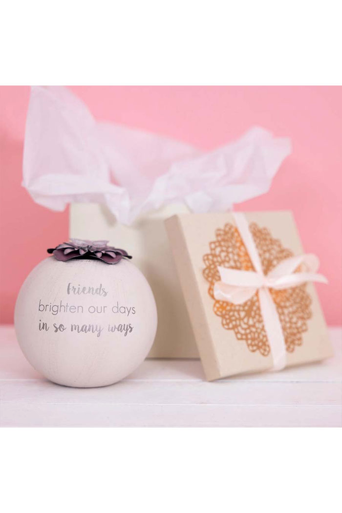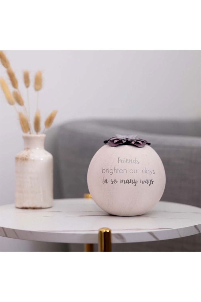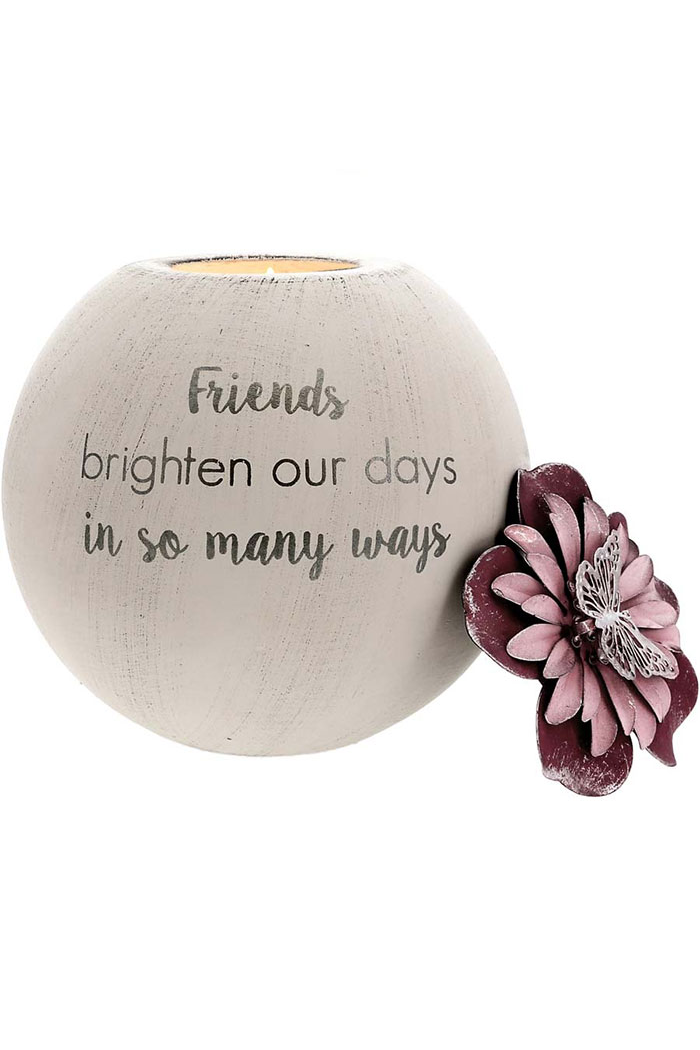 This tealight candle holder is made from terracotta and features a decorative pink flower-shaped metal topper that is adorned with a beautiful silver butterfly. The candle holder also includes one unscented tealight. A soft foam pad on the bottom of the vessel will protect furniture surfaces from scratches. . “Friends brighten our days in so many ways” text is printed onto the front of the candle holder. . Wipe clean only. Always take care around an open flame. The candle is packaged securely in a white die-cut box for safe shipping. . This elegant candle holder will complement the décor of any living room, bedroom, kitchen, or dining room. Fantastic for celebrating a housewarming, an apartment-warming, or a best friend just because. Remind your friends of the light they bring to your life.