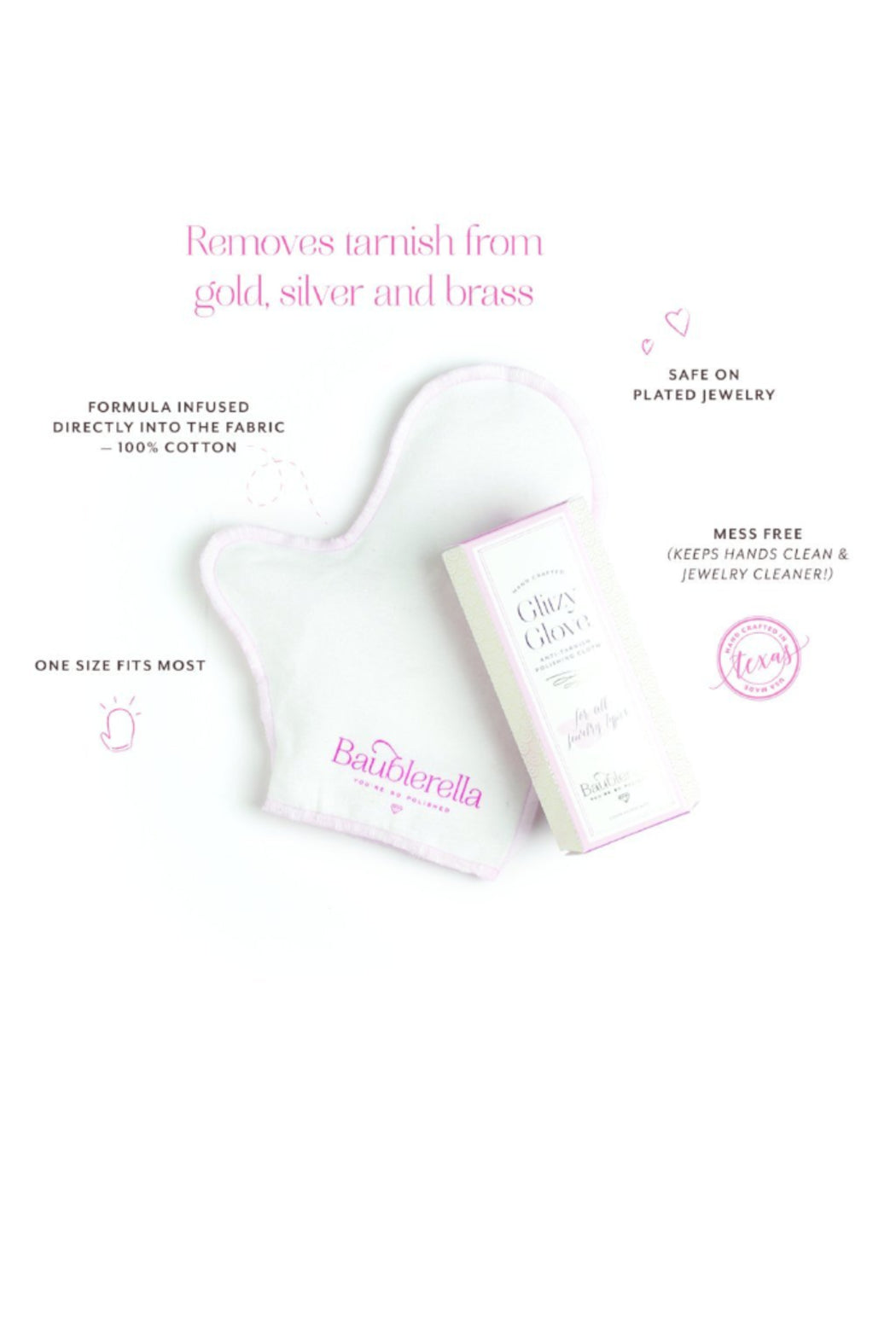 The Glitzy Glove is a hand-crafted jewelry polishing mitt that removes tarnish. It’s safe on silver, gold and brass metals.