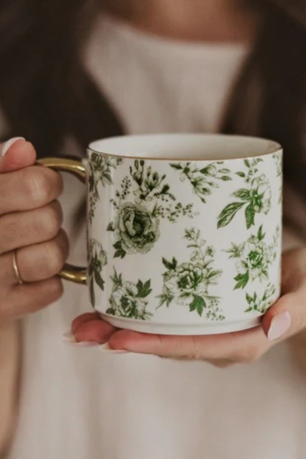 A beautiful Spring and Summer option with Green Delft Mug with Gold Handle. A stylish mug with flowers, perfect for tea or coffee lovers.