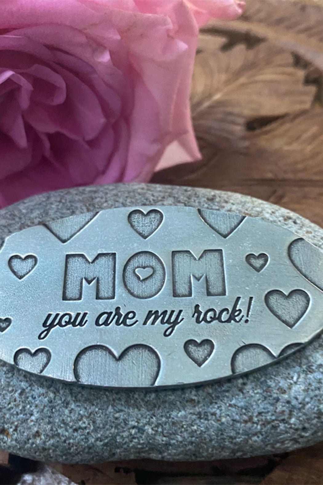 Mom, You Are My Rock. This unique handcrafted sentimental gift is a great gift for Mom for Mother's Day, birthdays, holidays or as a heartfelt thank you gift. Surprise your mom with this brand new addition to the Whitney Howard Design line of meaningful gifts. Each rock is substantial, weighing around 1.5 pounds and is 3-4" across. SENTIMENTAL GIFT FOR MOM Let your mother know how special she is to you each and every day with this wonderful sentiment "Mom you are my rock!" printed on a pewter plate and attached to a smooth river stone. GREAT AS A PAPERWEIGHT, IN A ROCK GARDEN AND MORE Each stone is unique, but measures approximately 3-4 inches in diameter and weighs around 1.5 lbs – so it’s a substantial ornamental rock with a loving message for your mom. SHE'S GOING TO LOVE IT At Whitney Howard Designs we design and create each piece by hand in our Southern California studio. We put as much love into each piece as we hope the recipient feels when she opens her gift. Details • Made in United States • Weight: 1 lb (453.59 g) • Dimensions: 3 x 3 x 1 in (7.6 x 7.6 x 2.5 cm)