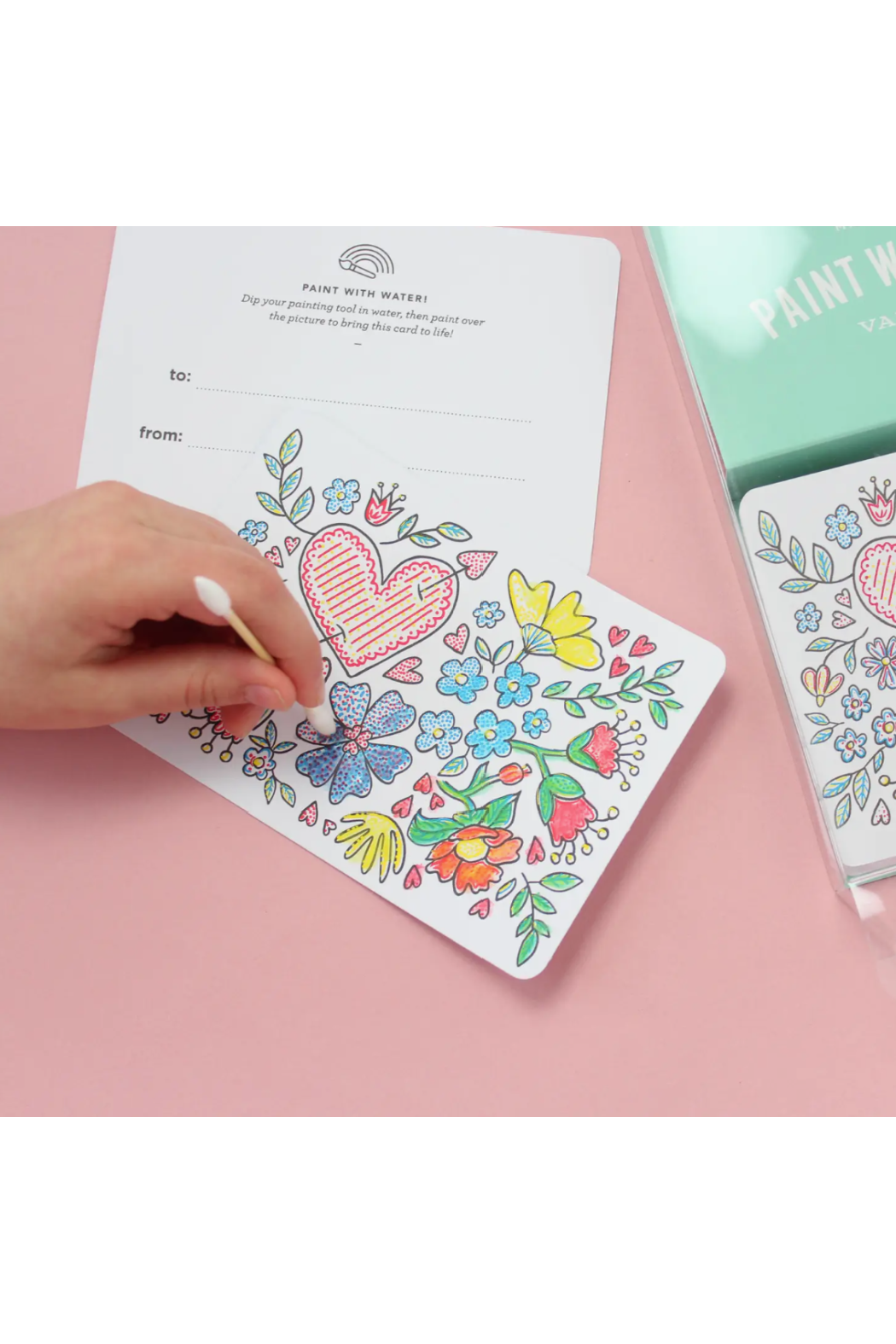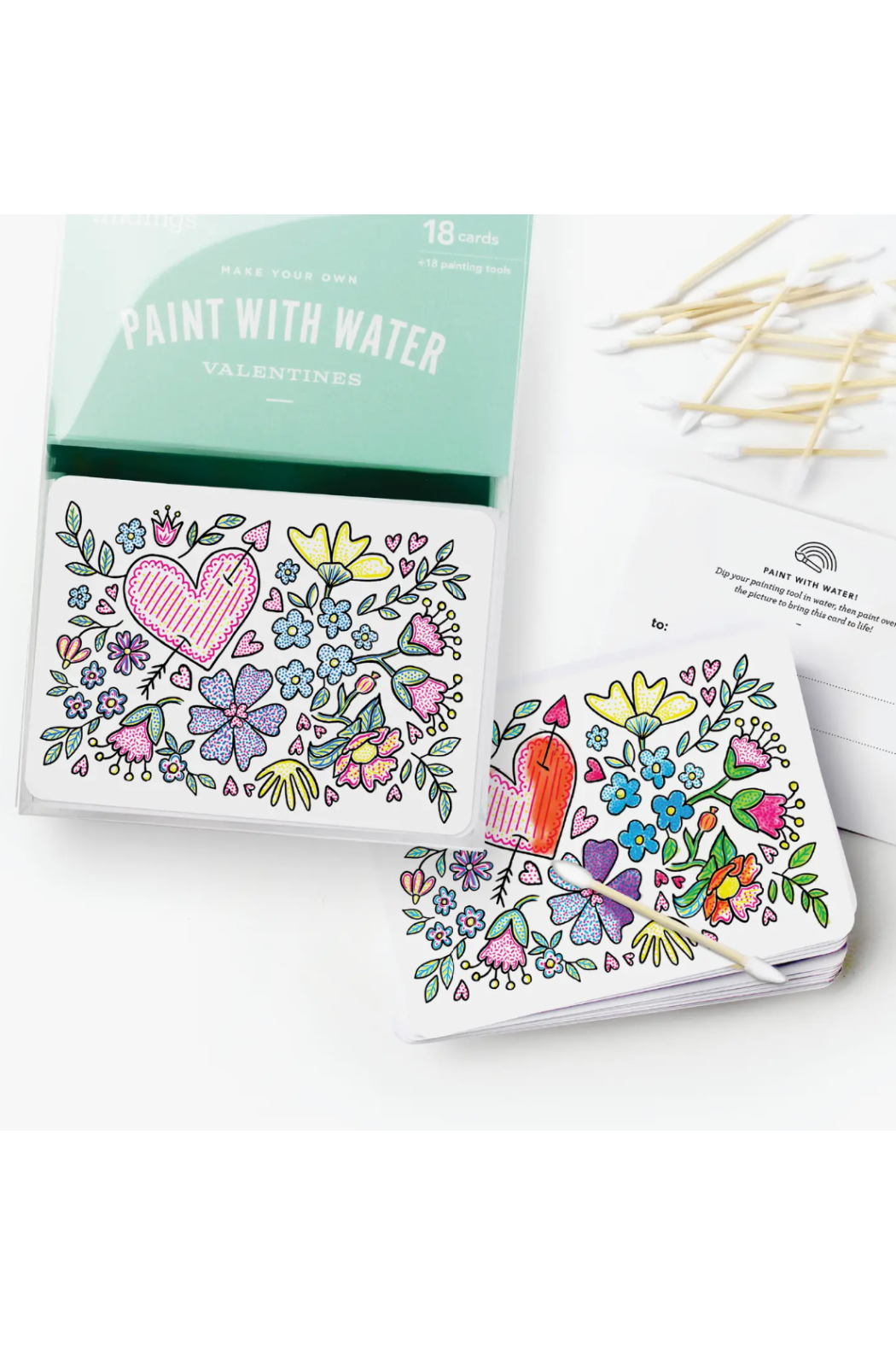 Our Paint With Water Valentine Kits are fun and interactive for all ages. Each box of valentines includes 18 flat cards (To/From on back), 18 painting tools, and 18 adhesive dots. Dip the cotton tip in water, then brush it over the card to bring the colors to life! Give your friends a sweet valentine and also an activity they can enjoy! Printed with vibrant, non-toxic inks. Card Size: 5.25" W x 3.75" H Box Size: 5"W x 7" L x 0.5" D