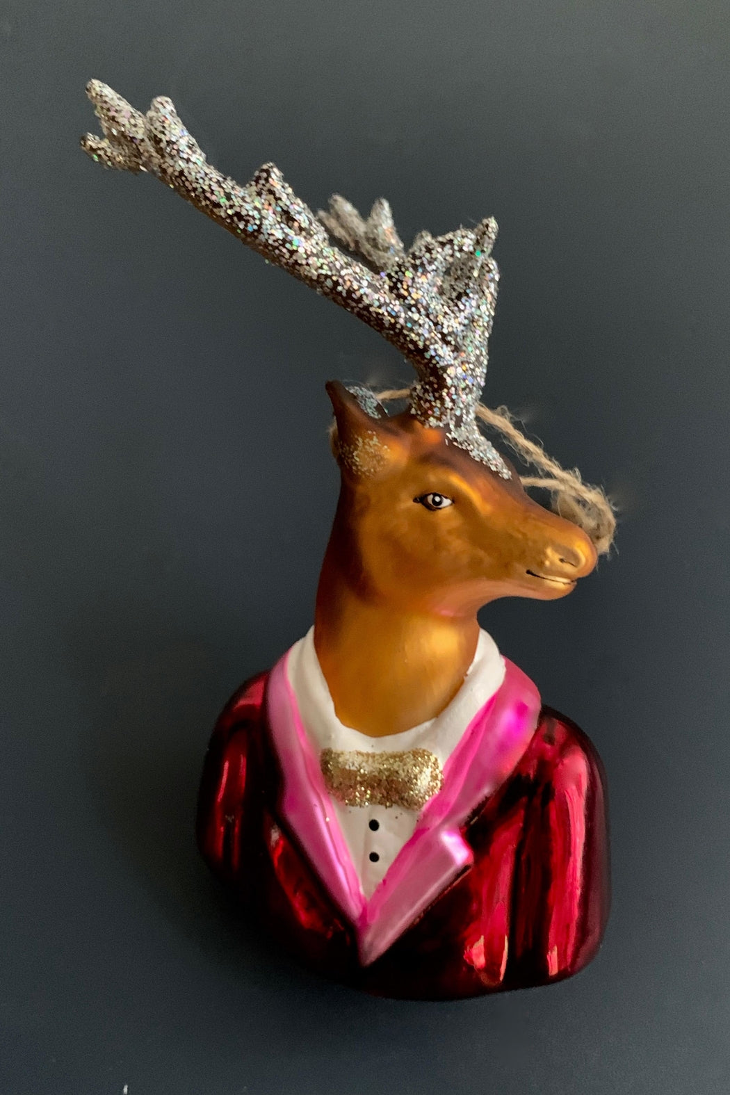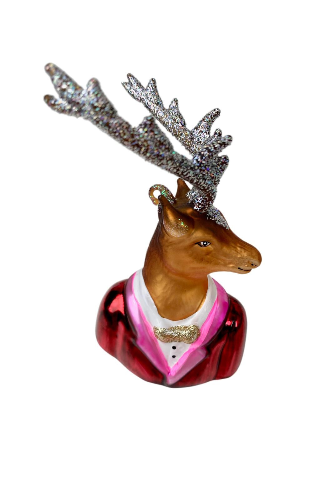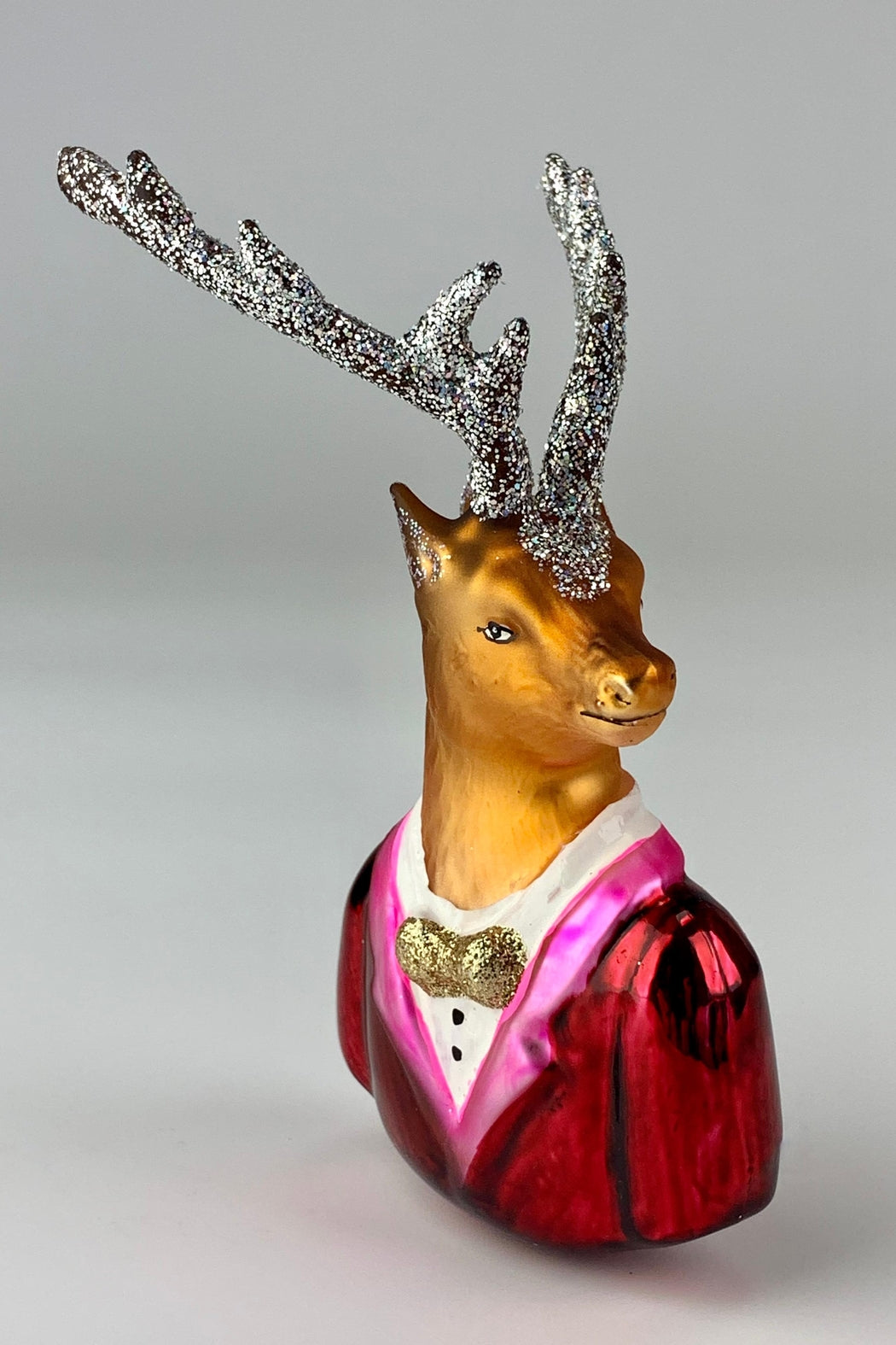 Quality hand painted blown glass Deer ornament with a bow tie and glitter antlers. Great as a gift or as a keeper. measurements: 4-1/2 tall x 2-1/2 wide x 3 deep