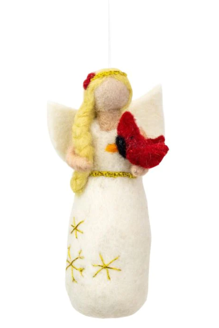 Fairtrade Handmade Wool Felt Angel holding a Cardinal hanging Ornament.