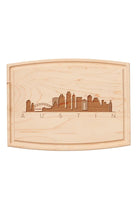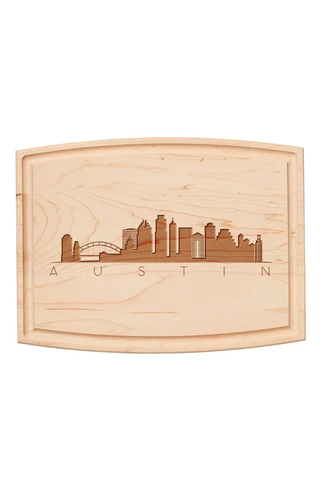 Show your hometown, city, and state pride with our best-selling "Skylines" artwork featuring Austin, Texas. A perfect gift for your hometown or destination. Crafted of premium hard rock Maple wood, this gorgeous cutting + charcuterie/cheese board is a workhorse that can be used for preparing food or as an impressive serving board or tray for cheese & charcuterie. This naturally self-healing and mark-resistant board are hand-finished with durable cutting board mineral oil to both protect the wood and bring out its natural grain. It will last a lifetime. Some variation in color & wood grain is part of the natural beauty of our spectacular boards. Great as a Serving Piece or as Wall Decor * Premium hard rock maple wood * Hand-sanded * Naturally self-healing and mark-resistant end-grain wood * Sealed with long-lasting, durable cutting board oil; oil regularly * Hand wash; wipe clean with a damp cloth * Imported
