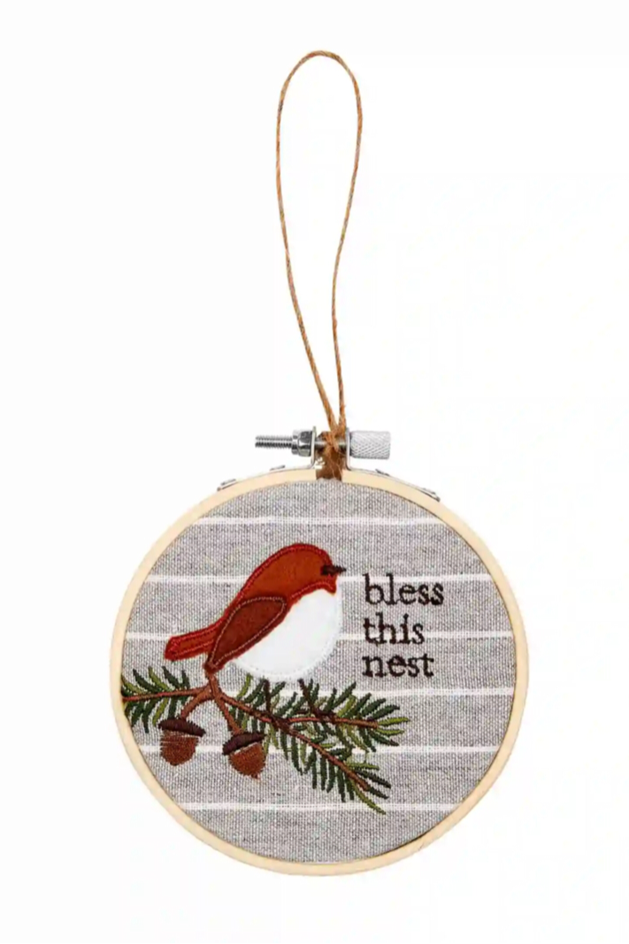 The grain sack embroidery hoop features an image of a bird sitting on a tree. Next to it, the ornament features the phrase “bless this nest”. This ornament hangs with a jute hanger. 4” diameter
