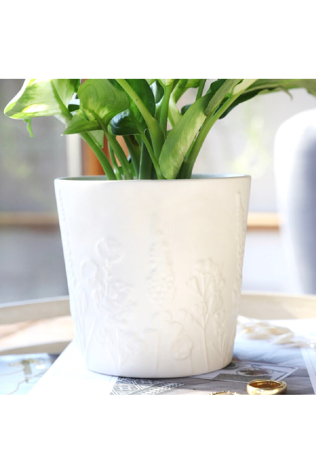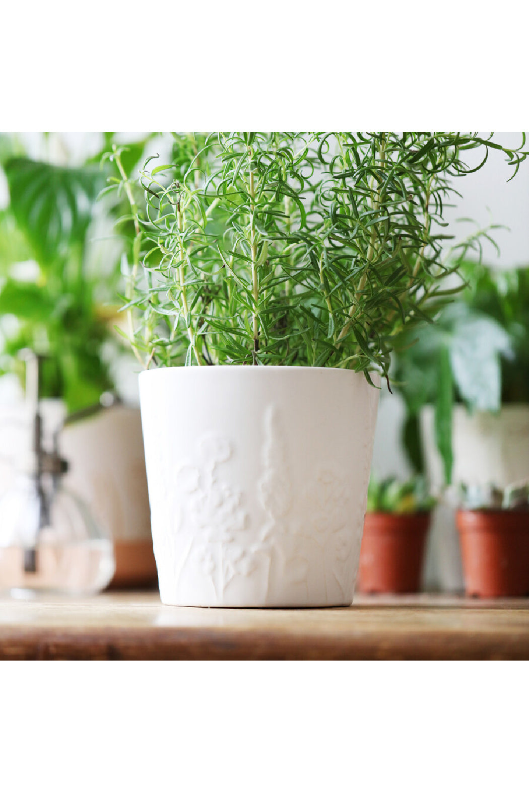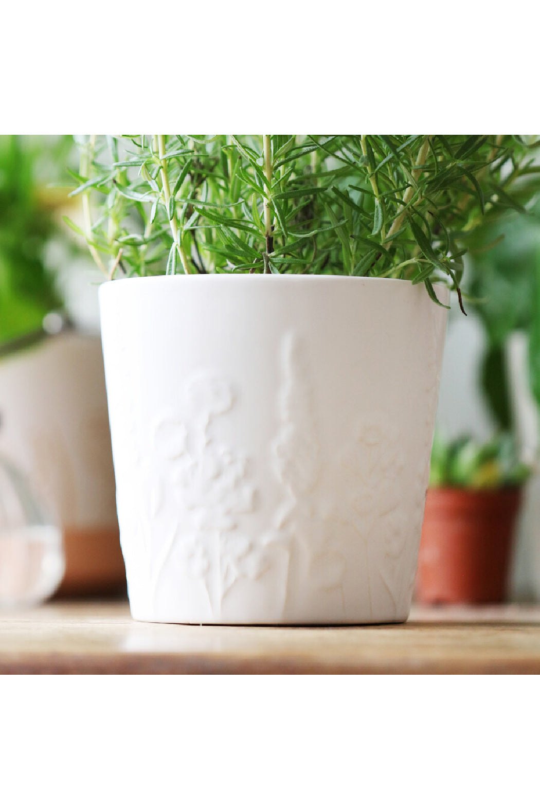 White ceramic planter Raised wildflower design Indoor plant pot Designed in-house Dimensions width 12.5cm x height 12cm x depth 12.5cm