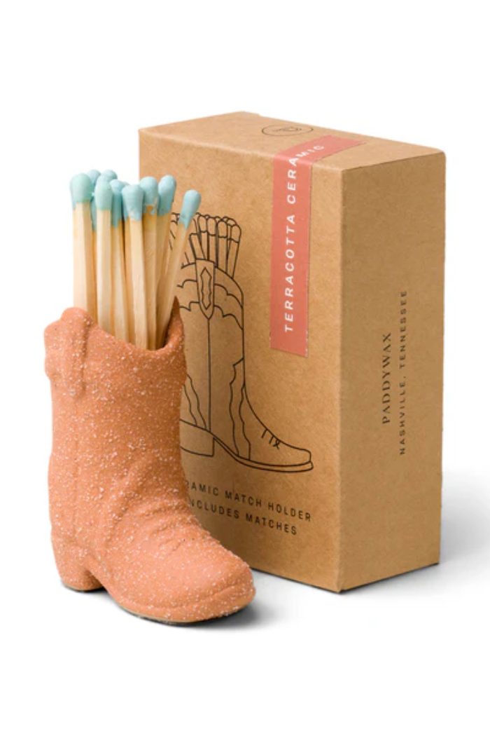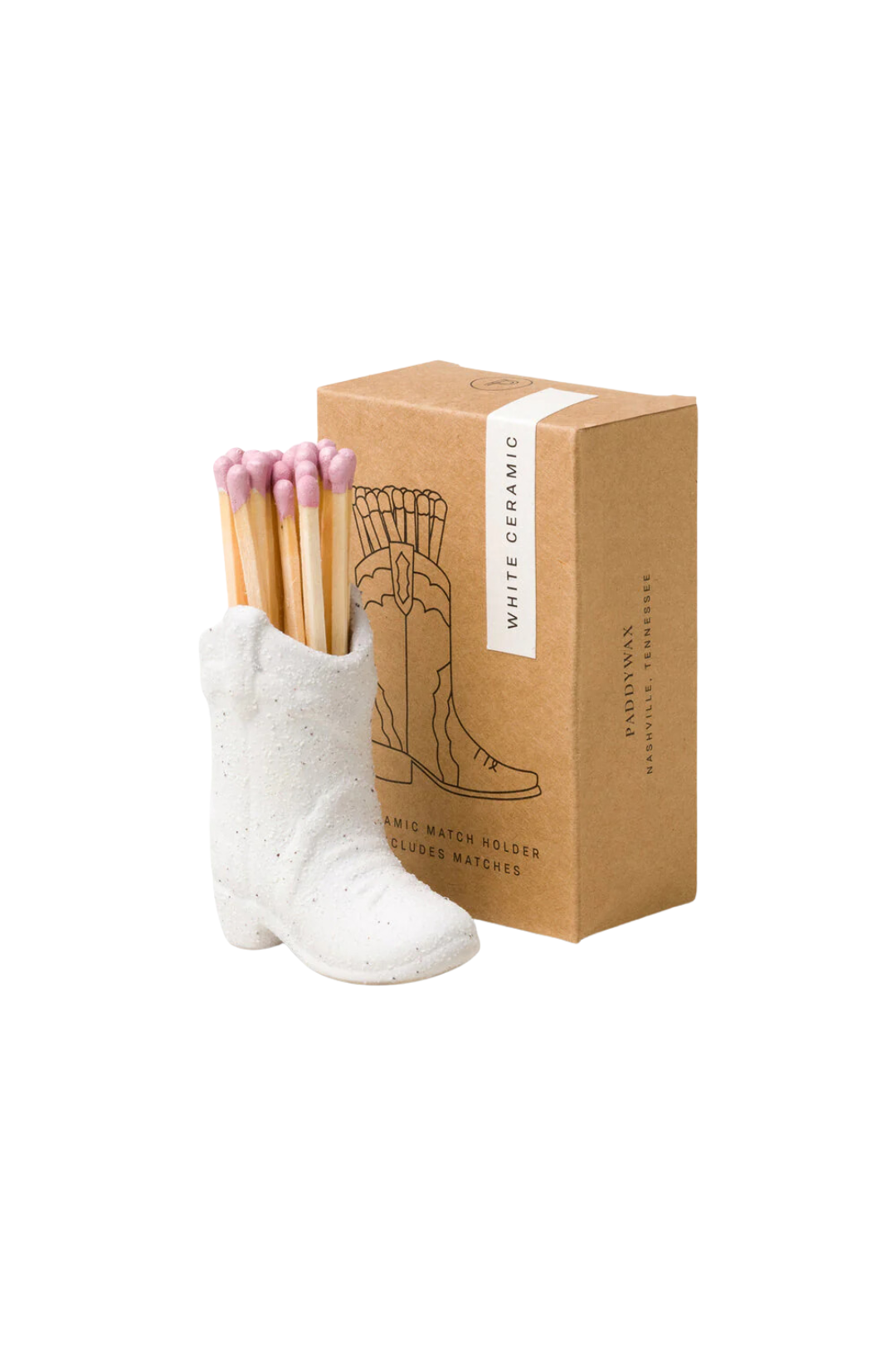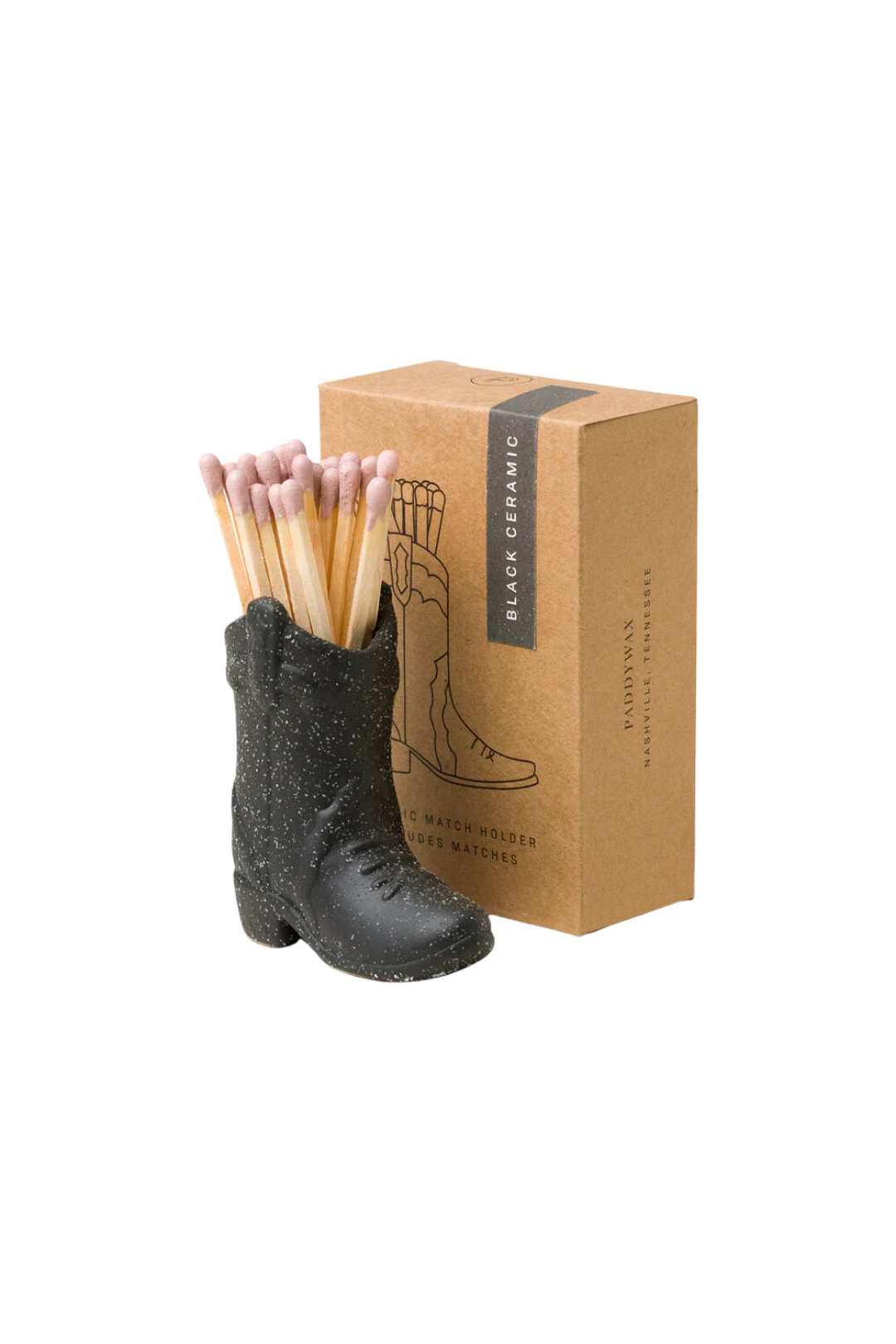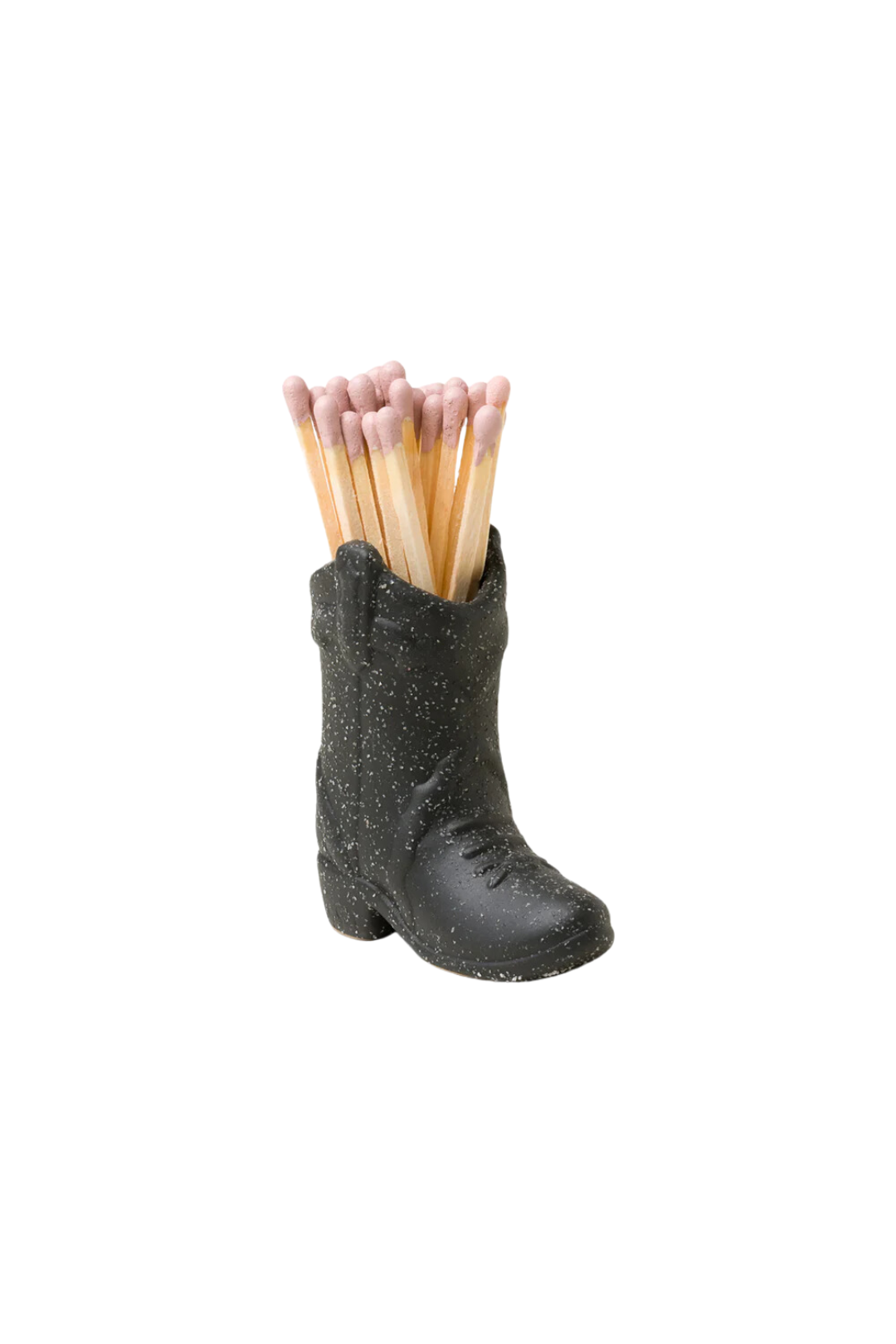 This Cowboy Boot Match Holder is perfect for setting the mood for your favorite Western-themed candlelight ritual. This vintage-inspired ceramic holder holds 25 safety matches, which can be lit with a strike on the boot's bottom. This matching set is visually appealing and a useful accessory for your shelves. A perfect gift set or bookshelf accessory also for Music City or Western fans.