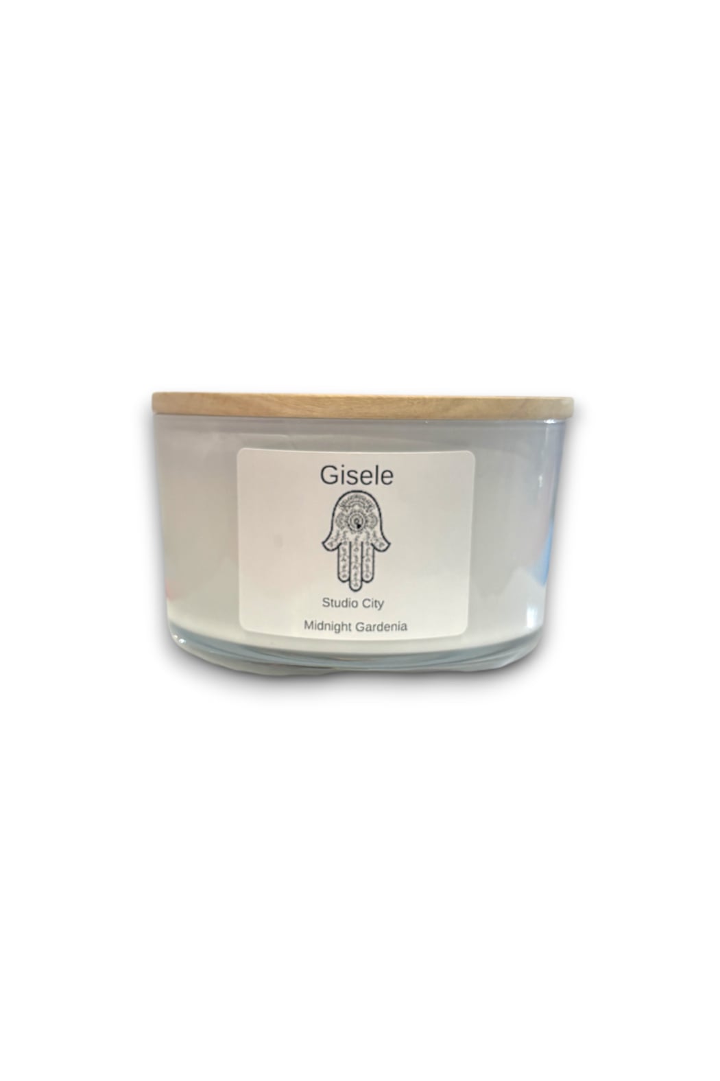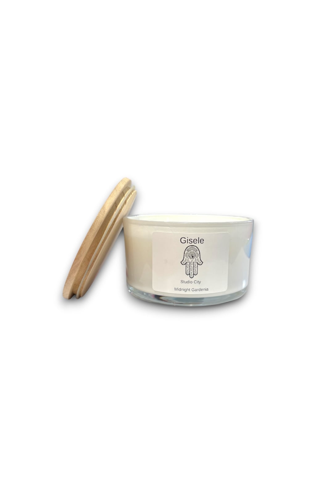 A double-wick scented candle poured in a clear glass jar with a wooden lid, offering a clean, floral Midnight Gardenia fragrance. The Double Wick Midnight Gardenia Candle adds ambient light and a long-lasting scent to living rooms, bathrooms, or bedside tables. This candle is offered by Gisele Tune Clothing and features a minimalist label and two cotton wicks for even burning.