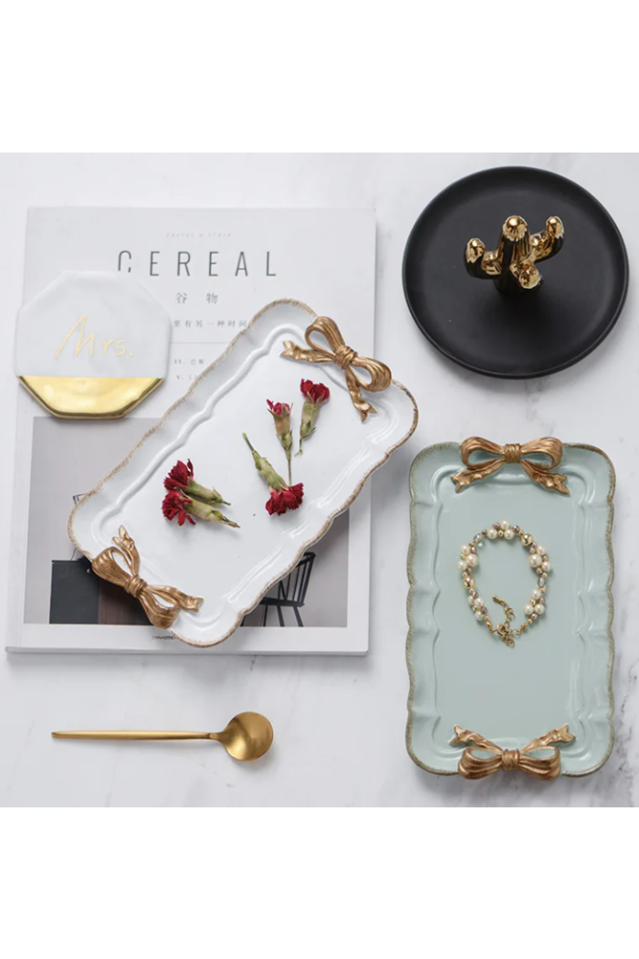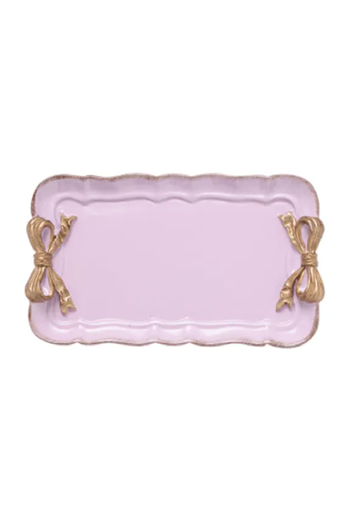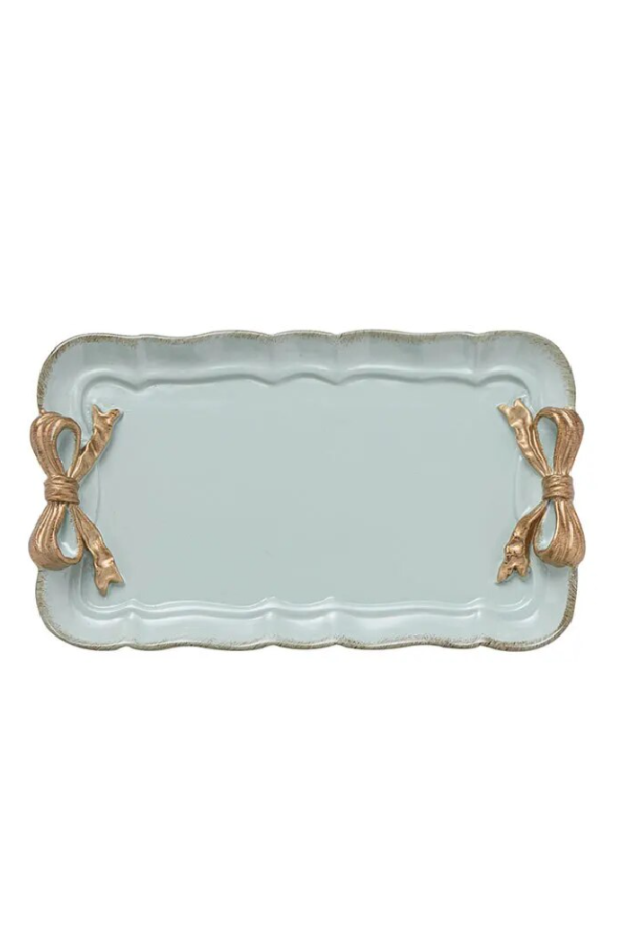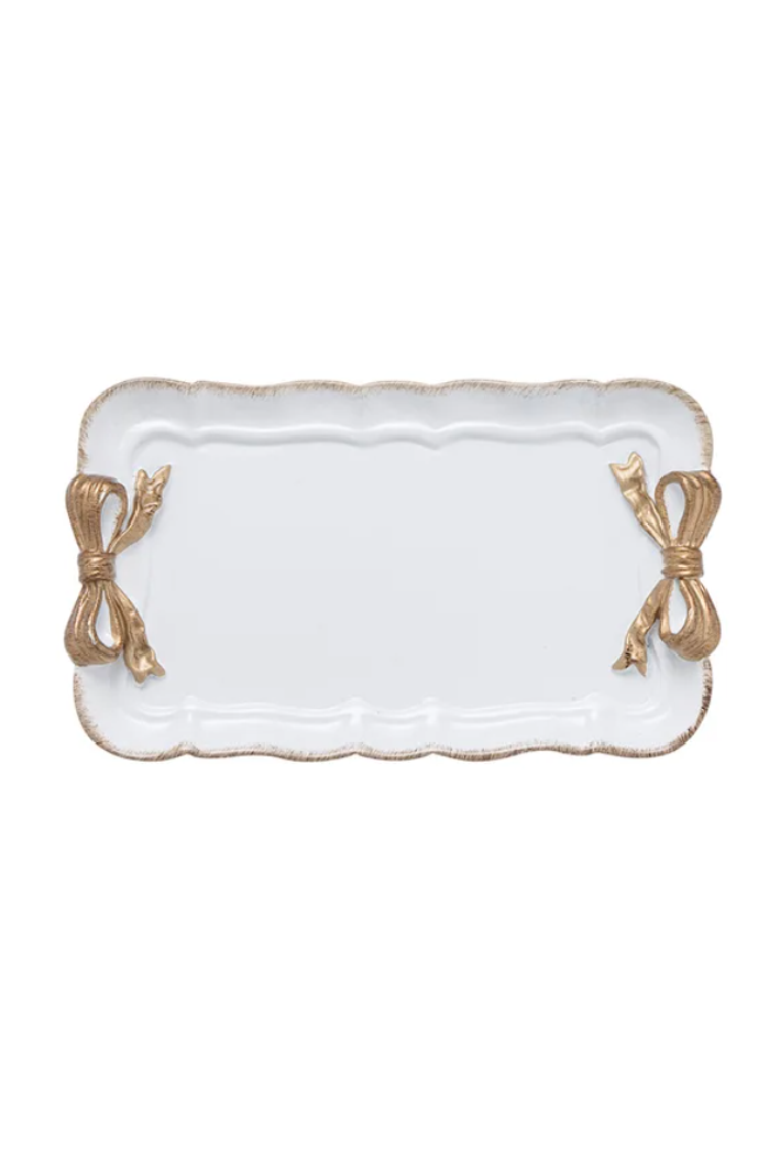 ELEGANCE MEETS FUNCTIONALITY . A DELICATE BOW KNOT ON EITHER SIDE OF TRAY FOR A SOPHISTICATED LOOK. BEAUTIFUL IN ANY ROOM OF THE HOUSE. ALSO AND GREAT GIFT.