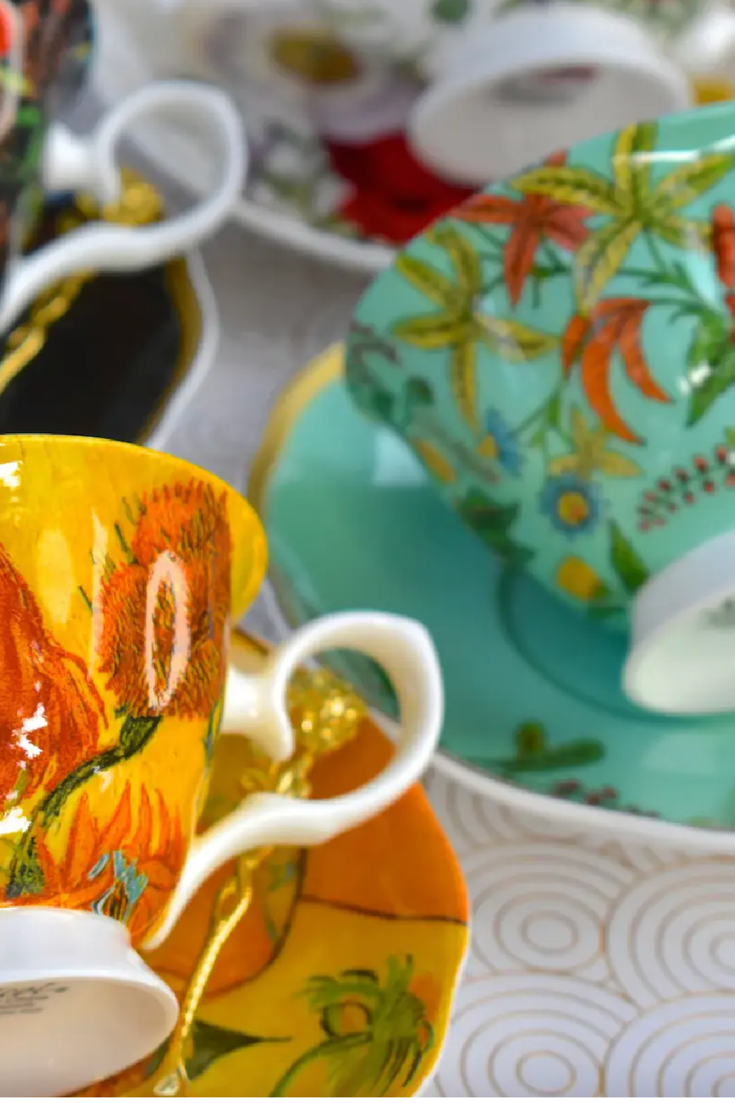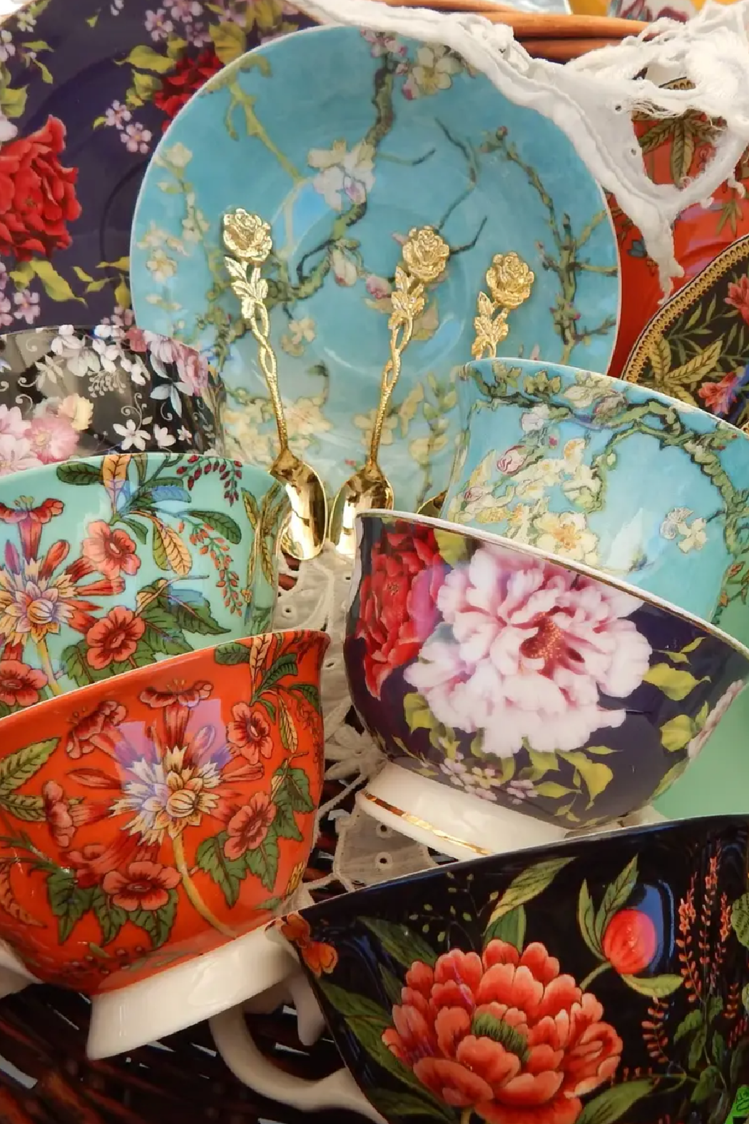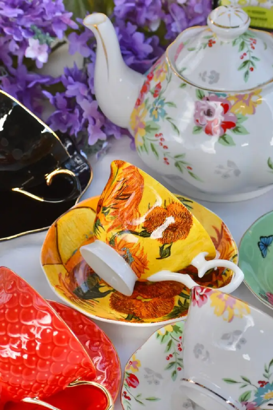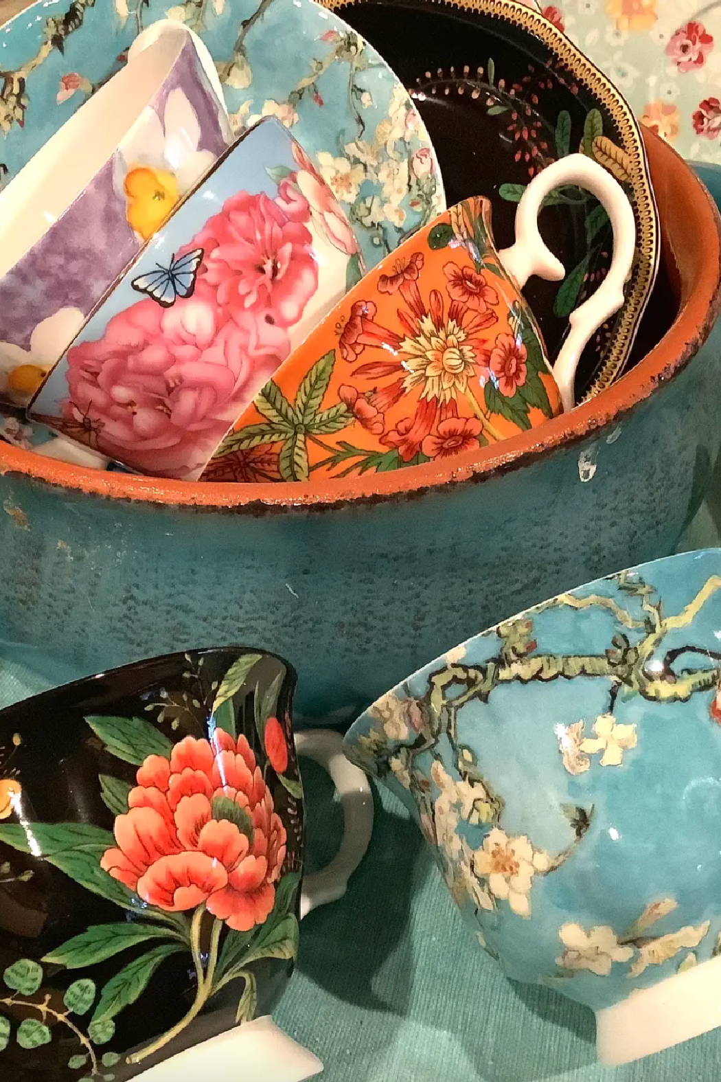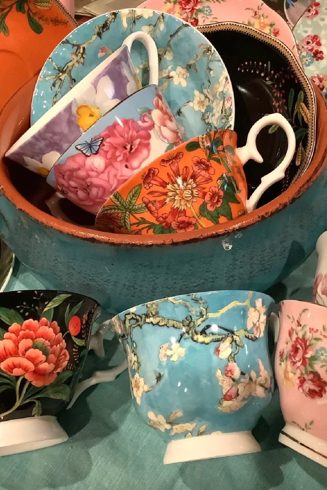 Random assortment of "Fiesta" themed Fine Bone China and/or Porcelain cups and matching saucers… Perfect for that “instant” vintage look!
