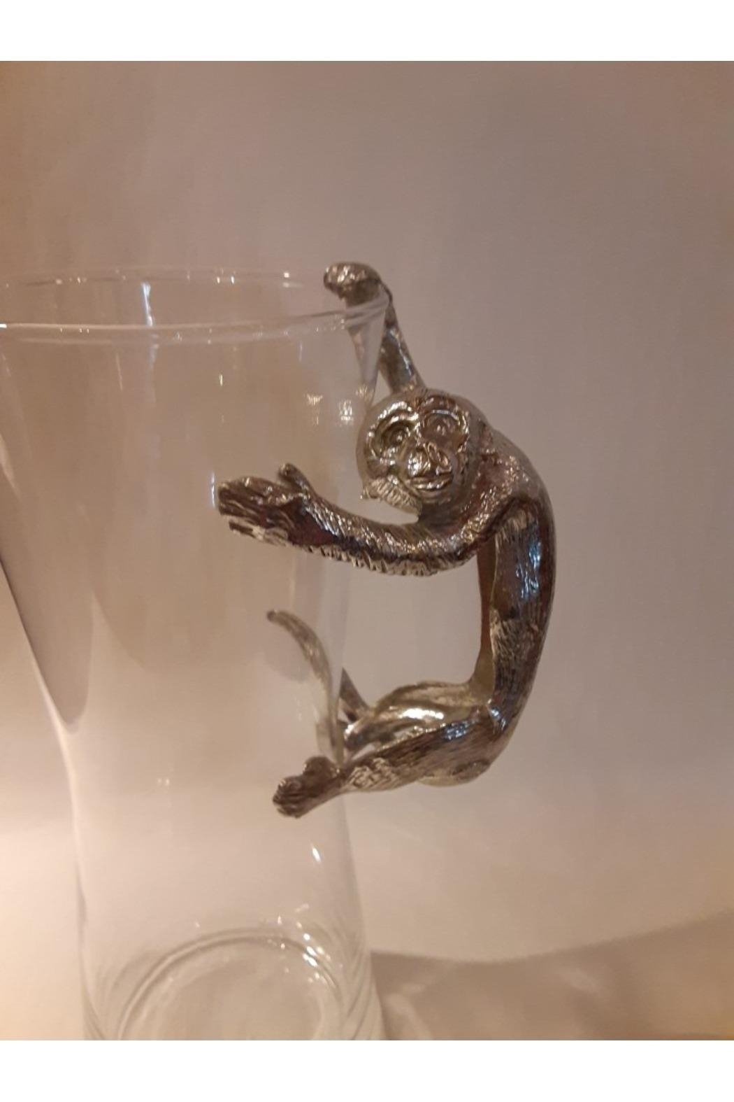 Glass pitcher adorned with a pewter handle, featuring a monkey scaling the side of the jug. Pitcher capacity: 32 fluid ounces. Reinforced lip and base for structural support. Food safe. A perfect accent to any home or serving occasion. Weight: 2 lbs. Height: 10 inches. Width: 4.25 inches (at widest point). Made in South Africa.