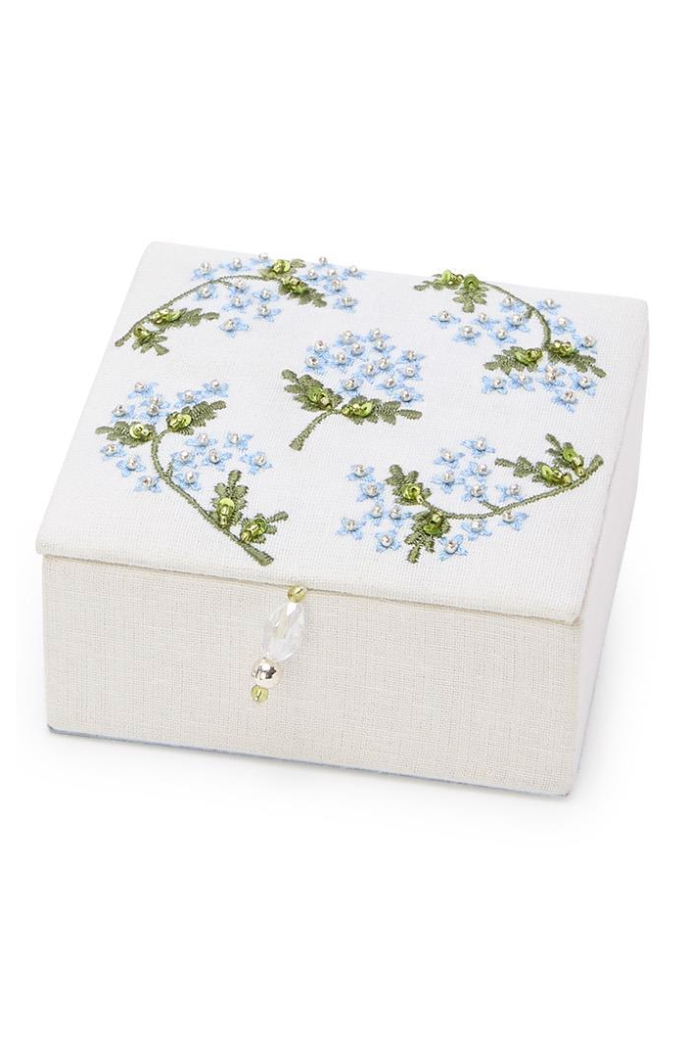 Add charm to your vanity or dresser with our Hydrangea Linen Fabric Small Jewelry Box. Handcrafted with exquisite attention to detail, this delightful piece features a beaded tassel puller and a stunning hydrangea beaded design in either blue or white. Made with a combination of MDF, cotton, glass beads, and metal, this jewelry box exudes elegance and functionality. Ideal for storing your favorite pieces, it adds a touch of sophistication to any room. Hand beaded with attention to detail Features a beaded tassel puller for added elegance Ideal for storing jewelry or small trinkets Made from high-quality materials for durability