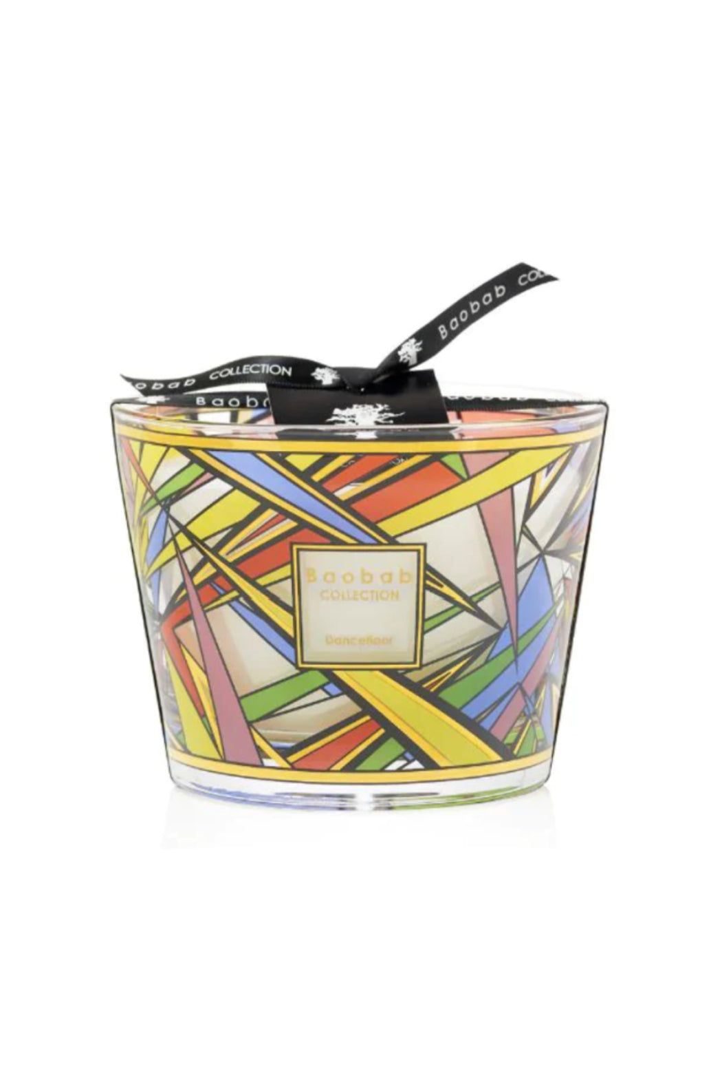 The Dancefloor scented candle is covered with a silk-screened print in a mix of gold and primary colors. The very graphic design represents our stylized interpretation of nightclub light beams. Its woody scent of patchouli, coriander and tonka bean will fill you with the magical and festive spirit of the best parties.