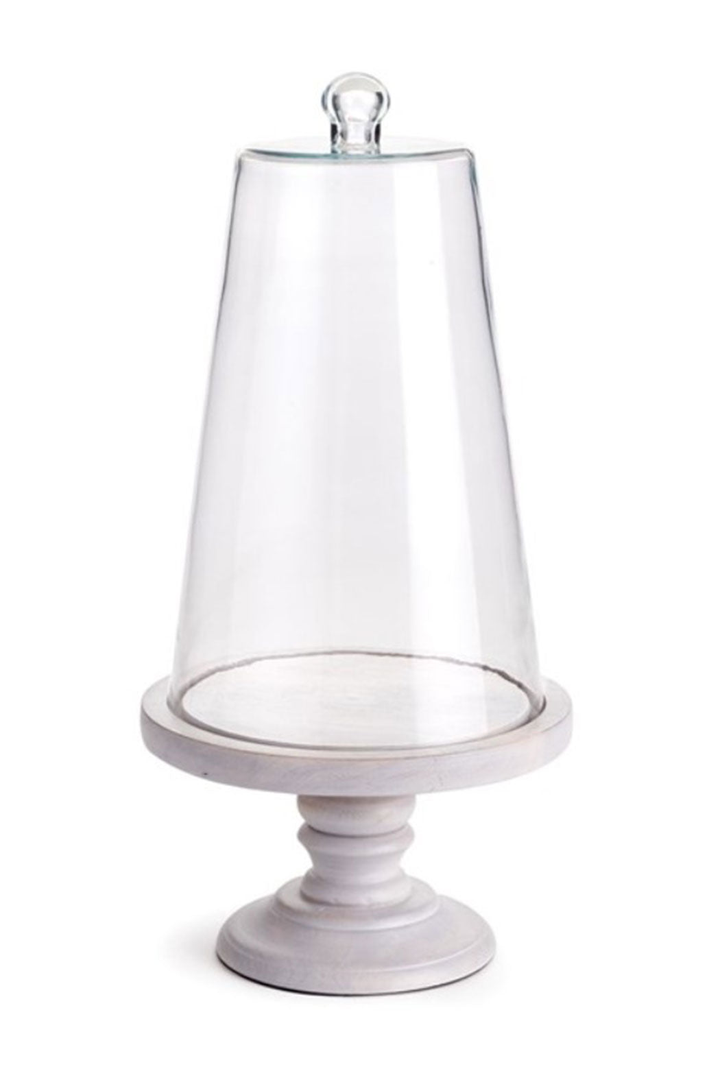 Classic in design with a whitewashed turned wood base, this cloche is light and lovely. A beautiful way to display natural elements, flameless candles or ornaments. Decorative interior use only. Dust with soft cloth. Dimensions: 9" x 9" x 18.5"