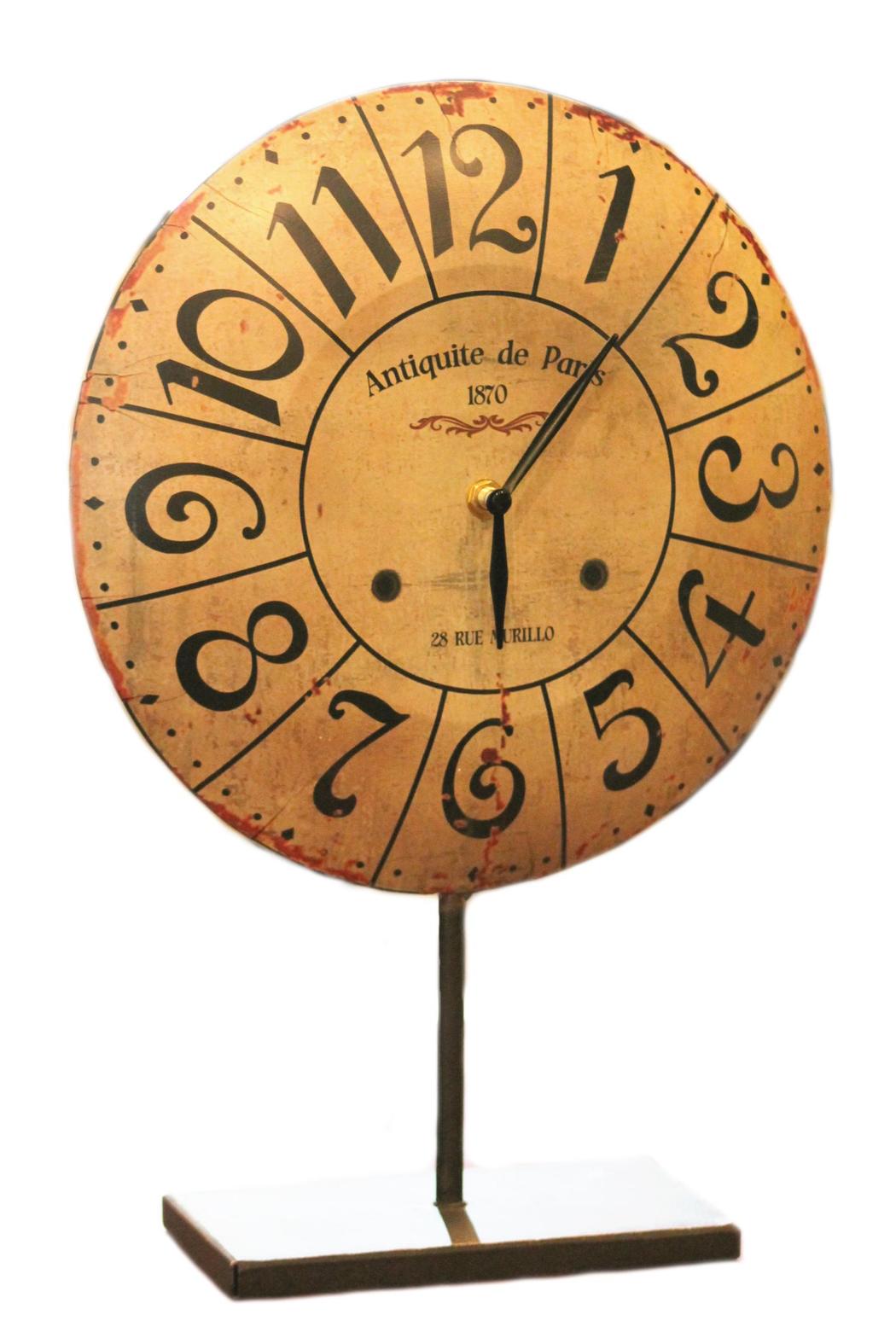 Distressed cream metal table clock on a brown metal stand. Looks fabulous on a mantle or side table. Measures 17" tall. Clock face is 12" in diameter.