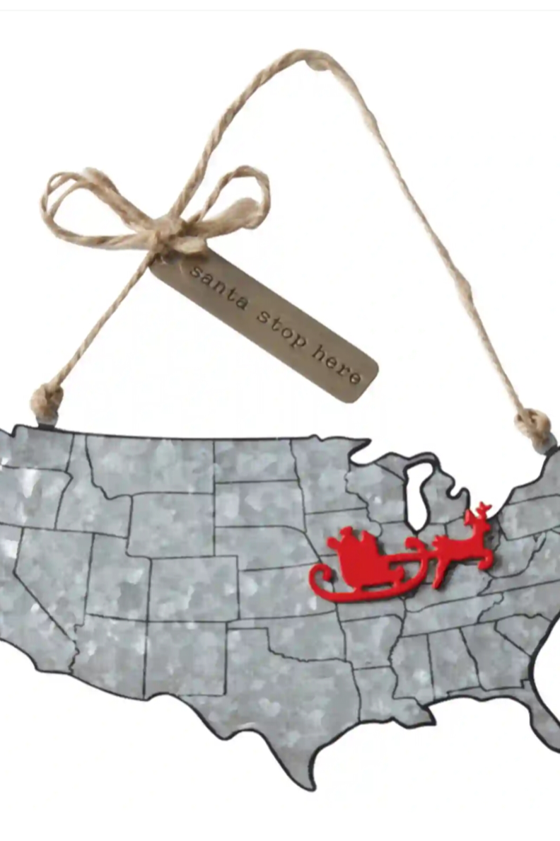 Trim your tree in style with this galvanized Santa stop here United States shaped ornament, featuring printed details, jute rope hanger and a gold metal tag with debossed “Santa stop here” sentiment. This 2-piece set pairs with a movable red sleigh magnet to mark “where home is”. 3 3/4” x 6 1/2”
