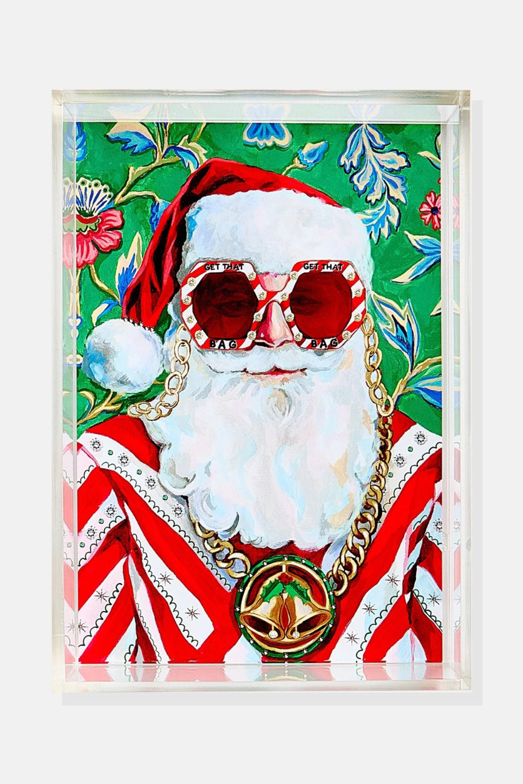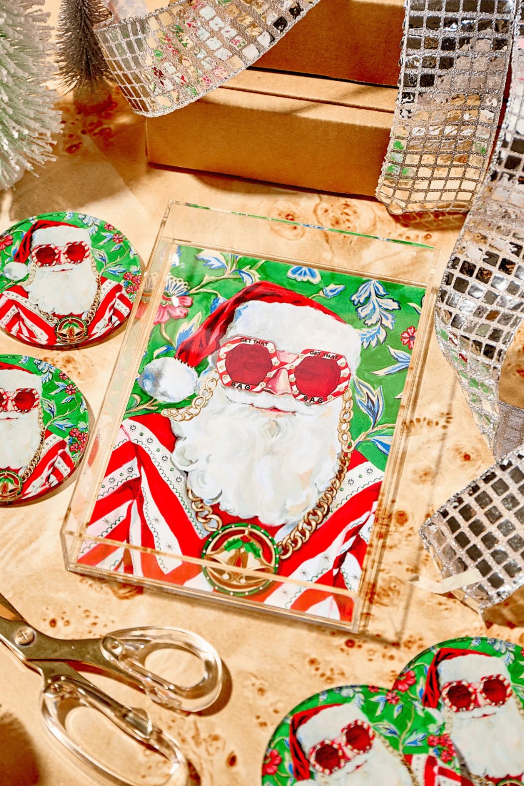 Santa's gone glam! Our Swanky Santa Small Tray brings all the holiday attitude with a pop of color, bold style, and that cheeky sparkle that makes your space instantly festive. Made of durable acrylic and handcrafted with love in Dallas, this tray is perfect for serving cocktails, cookies, or as a statement piece on your coffee table. Perfect for holiday hosting, Christmas brunches, and festive get-togethers that call for a little sparkle and a lot of style. Features: - Size: 6.5" L x 9.5" W x 1.5" H - Made of acrylic - Handmade with love in Dallas, Texas - Use a soft damp cloth to clean and keep inside.