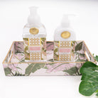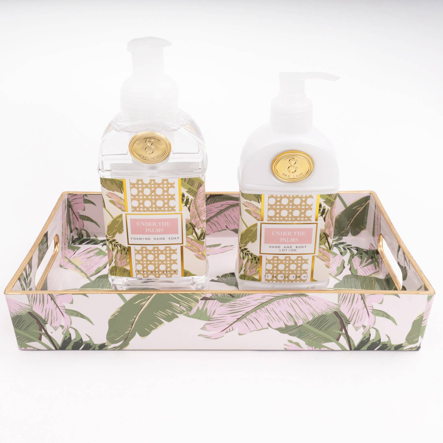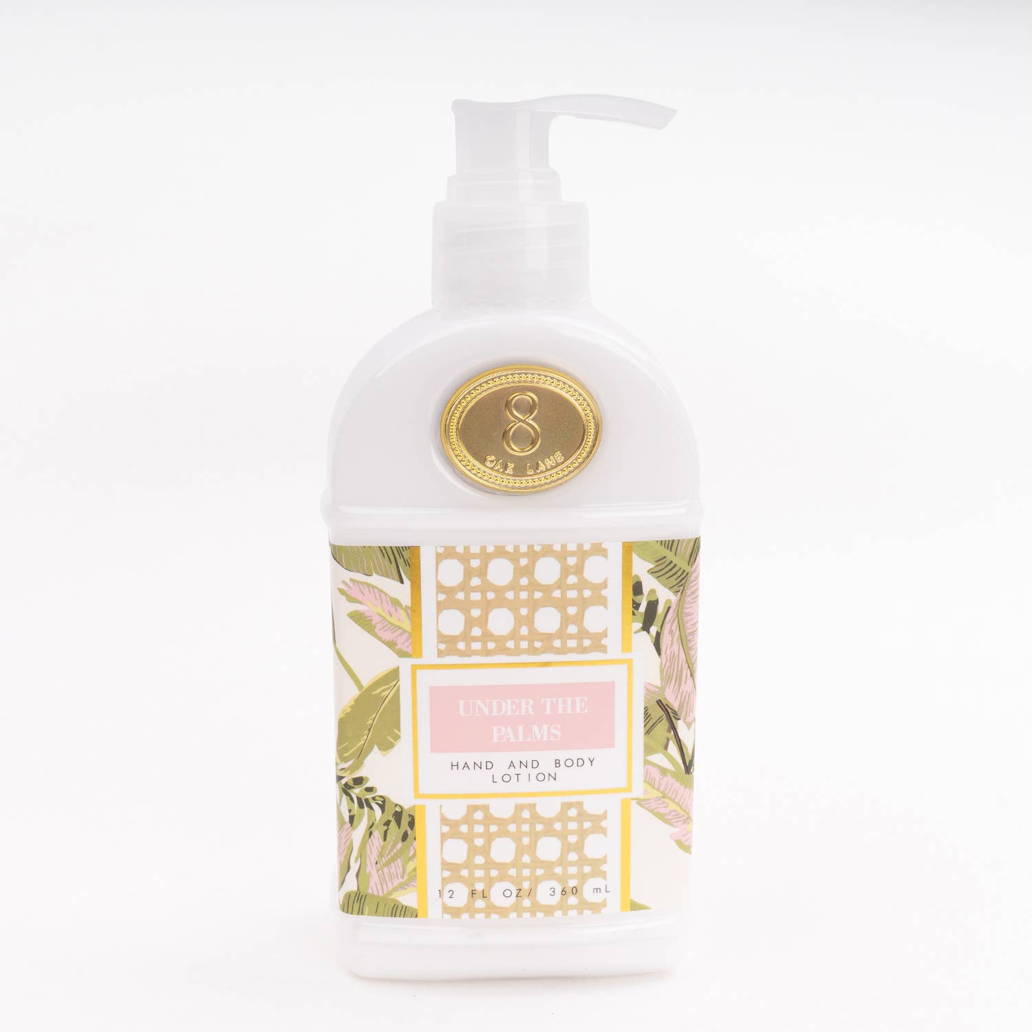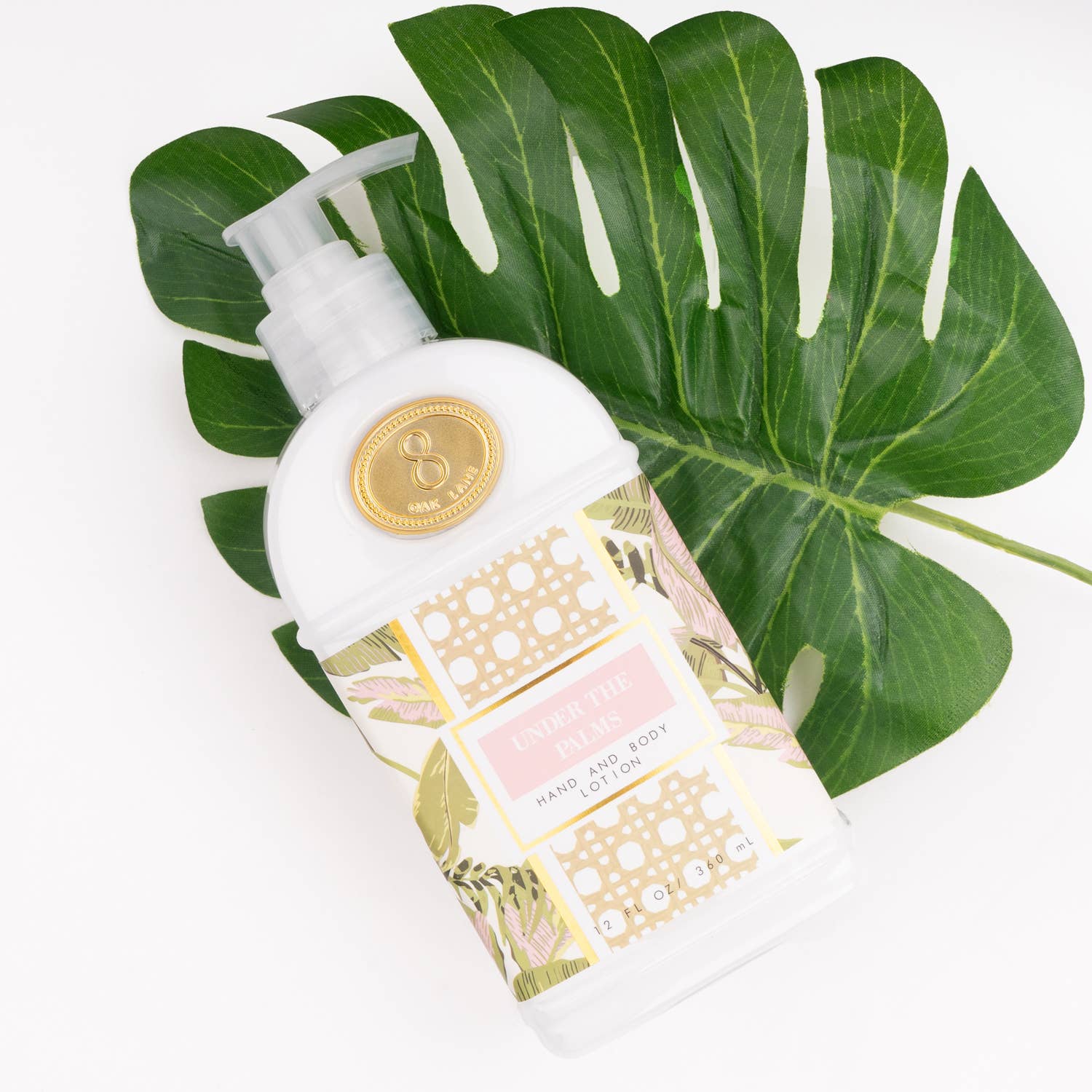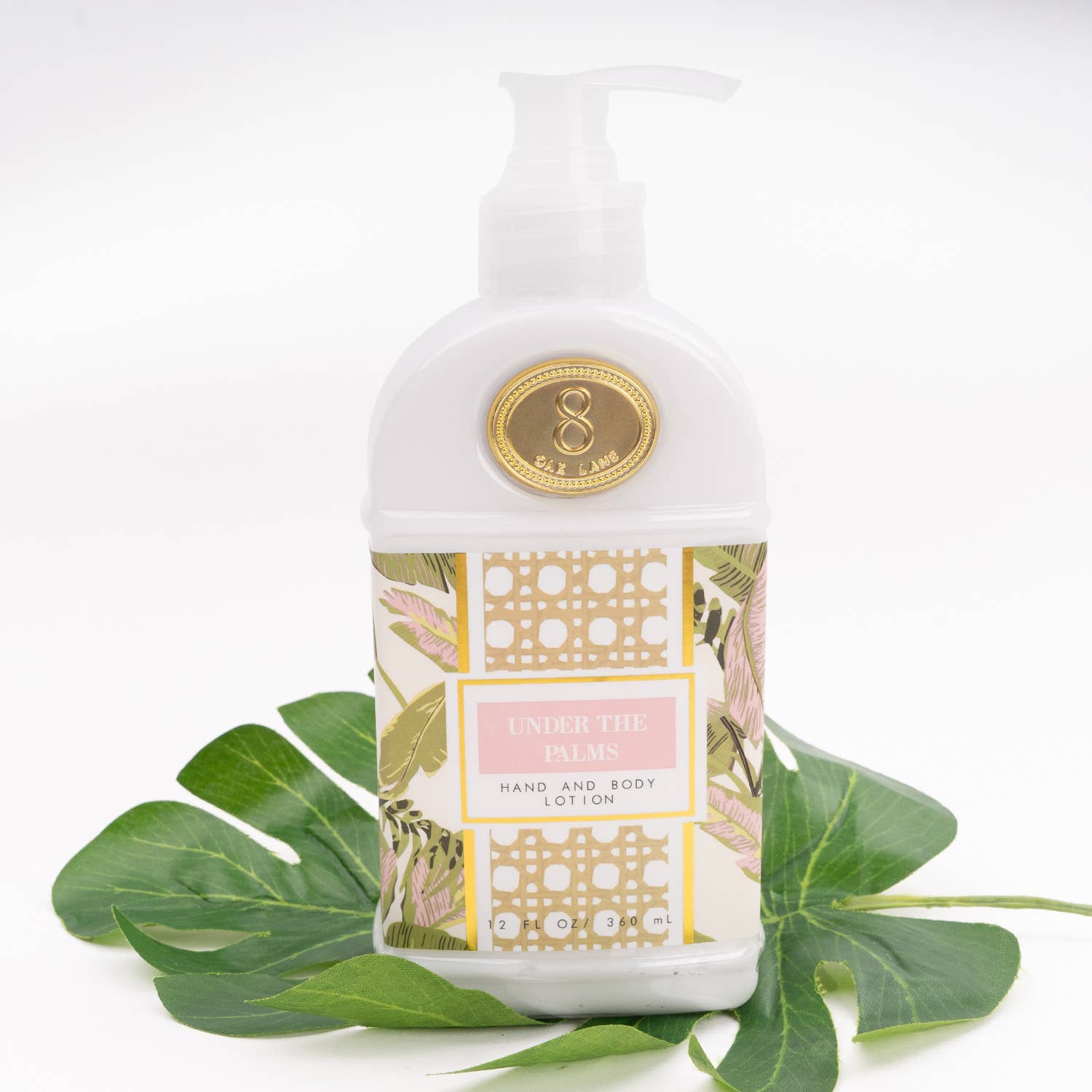 Introducing our luxurious Hand & Body Lotion with nourishing shea butter in our captivating Under the Palms fragrance, a delightful blend of herbaceous grapefruit, citrusy bergamot, green leaves, fresh mint, & warm amber. This hand & body lotion is here to elevate your moisturizing experience & transport you to a world of refreshing indulgence! Crafted with meticulous attention to detail, this luxurious hand & body lotion hydrates effortlessly, turning every pump into a soothing experience. Packaged in a stunning and generously sized bottle featuring an intricate botanical print, making it an elegant addition to your home decor or the perfect gift. Not only does this luxurious hand & body lotion boast a captivating fragrance and impeccable aesthetics, but it also delivers quality. 300ml Scent - Grapefruit, Bergamot, Green Leaves, Mint, & Amber Designed in the USA; Imported