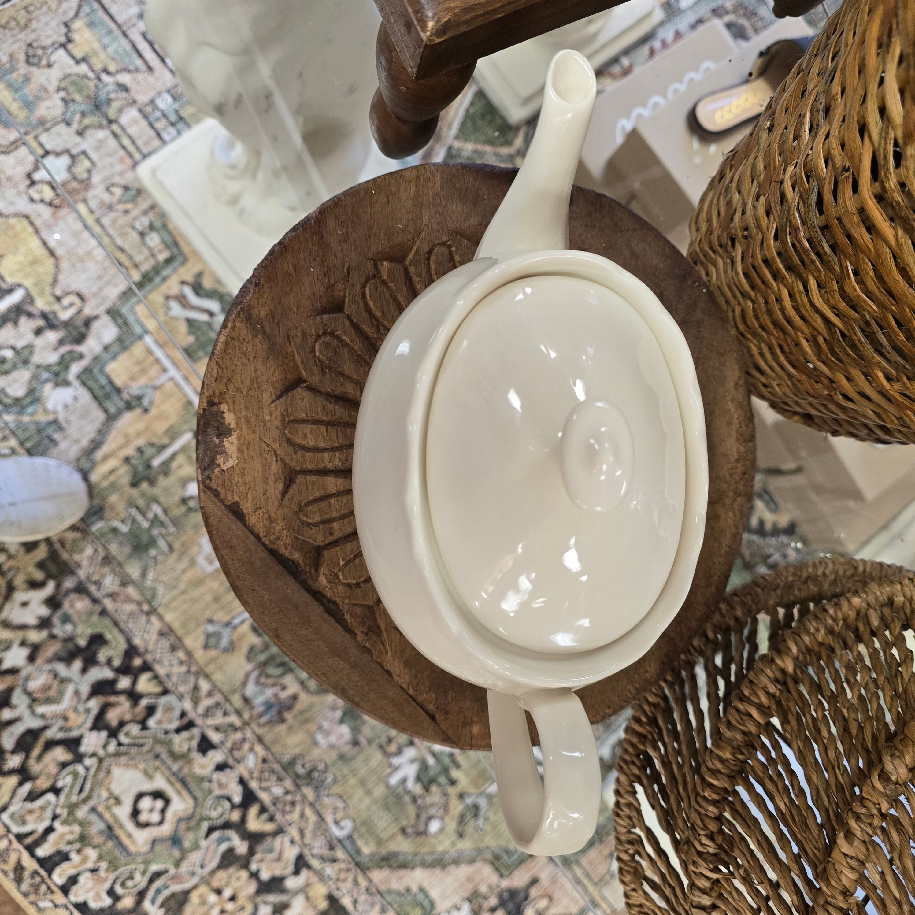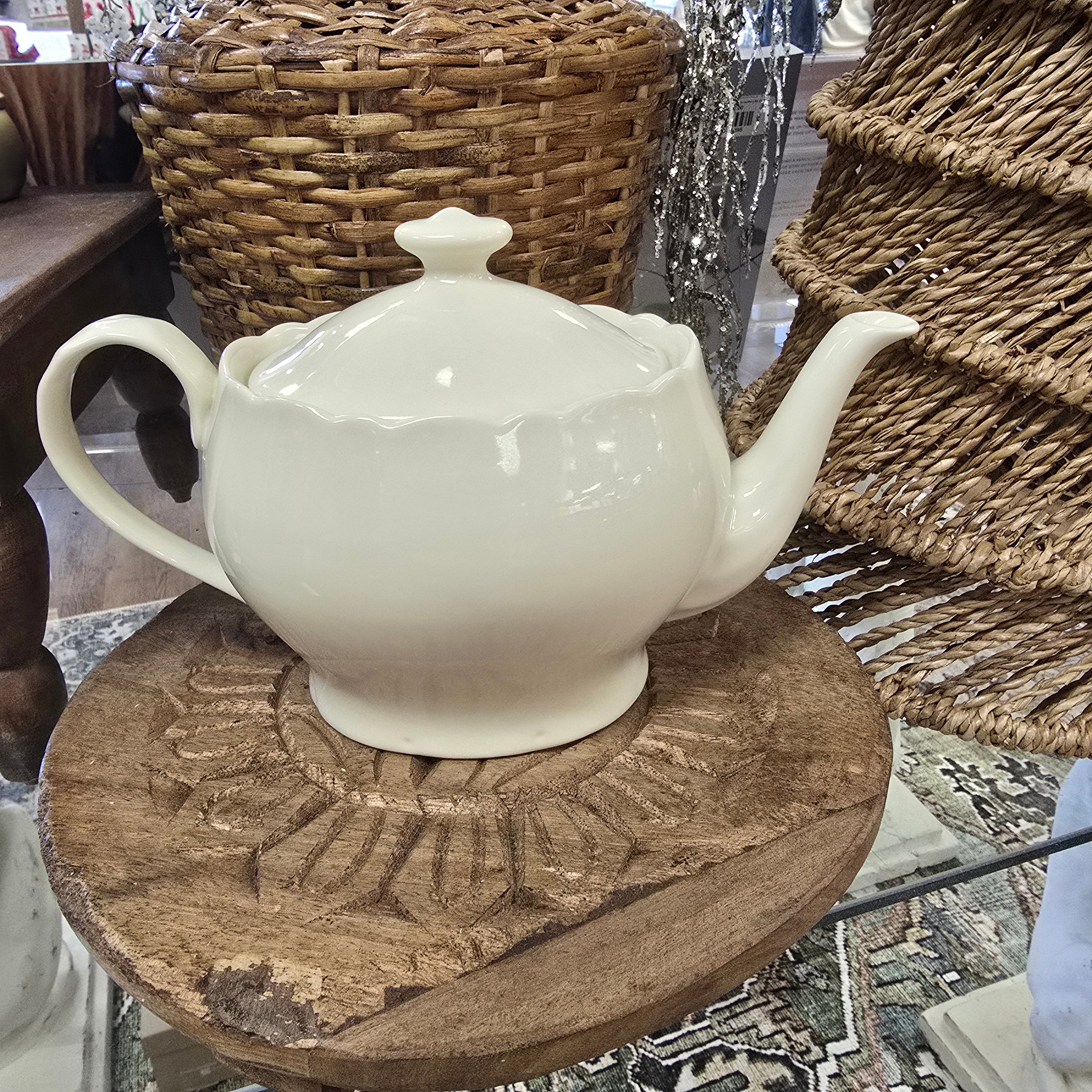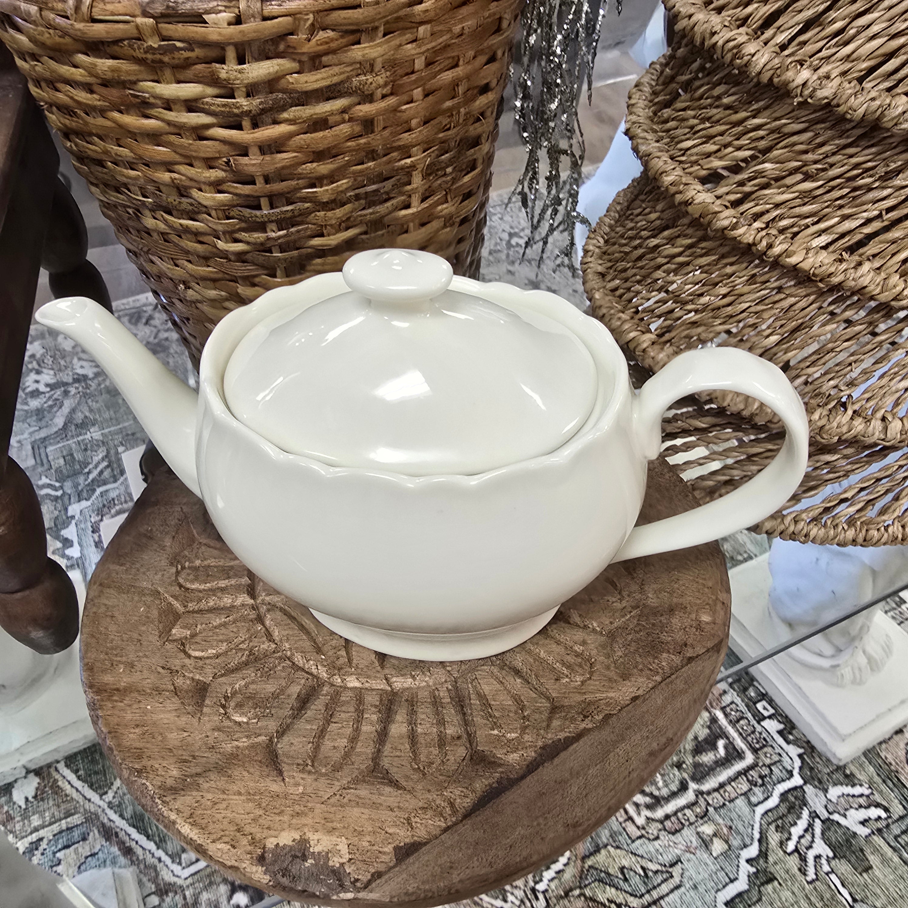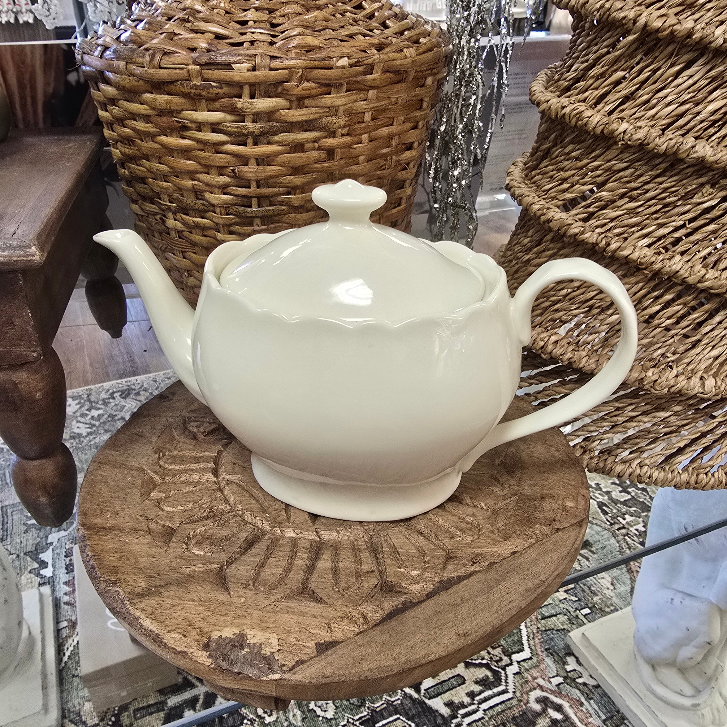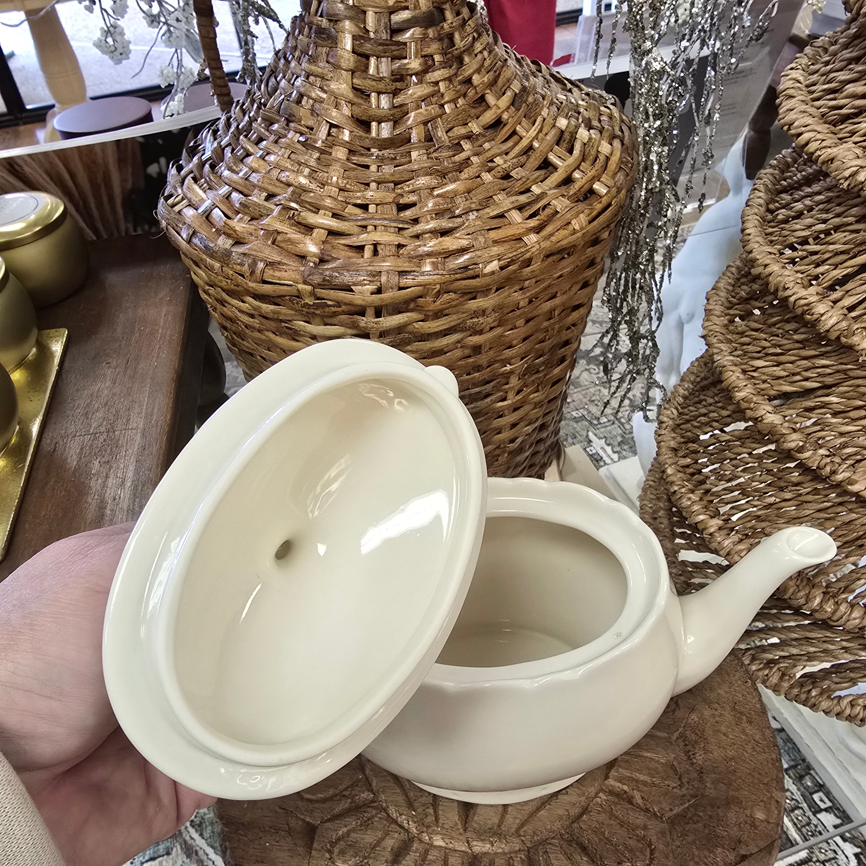 This vintage Godinger & Co. creamware pitcher is in excellent condition with no chips or scratches. Made from ivory porcelain, it stands at 10.5" from spout to handle and 6.5" from bottom to top of lid. Serve up some charm and nostalgia with this quirky addition to your kitchen.