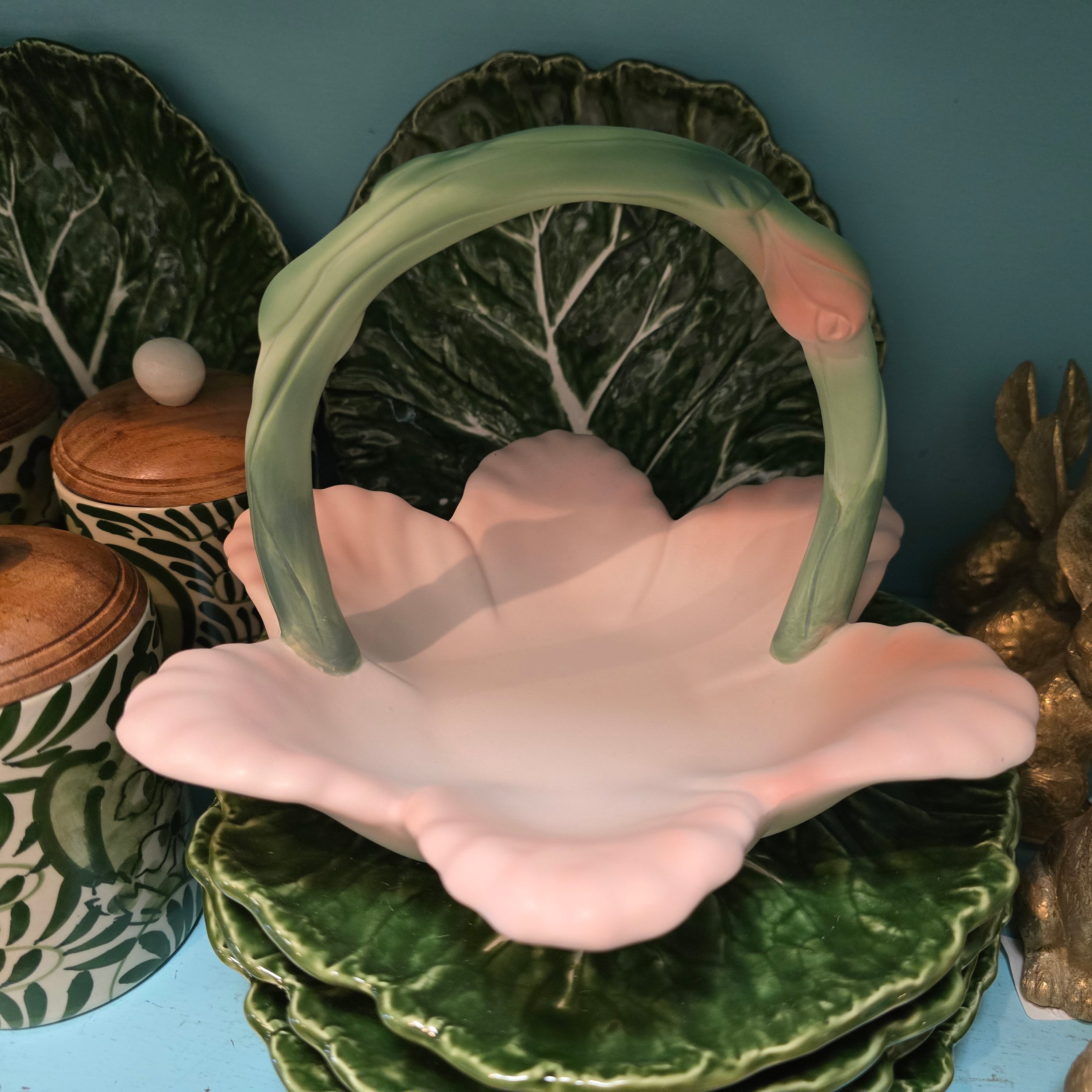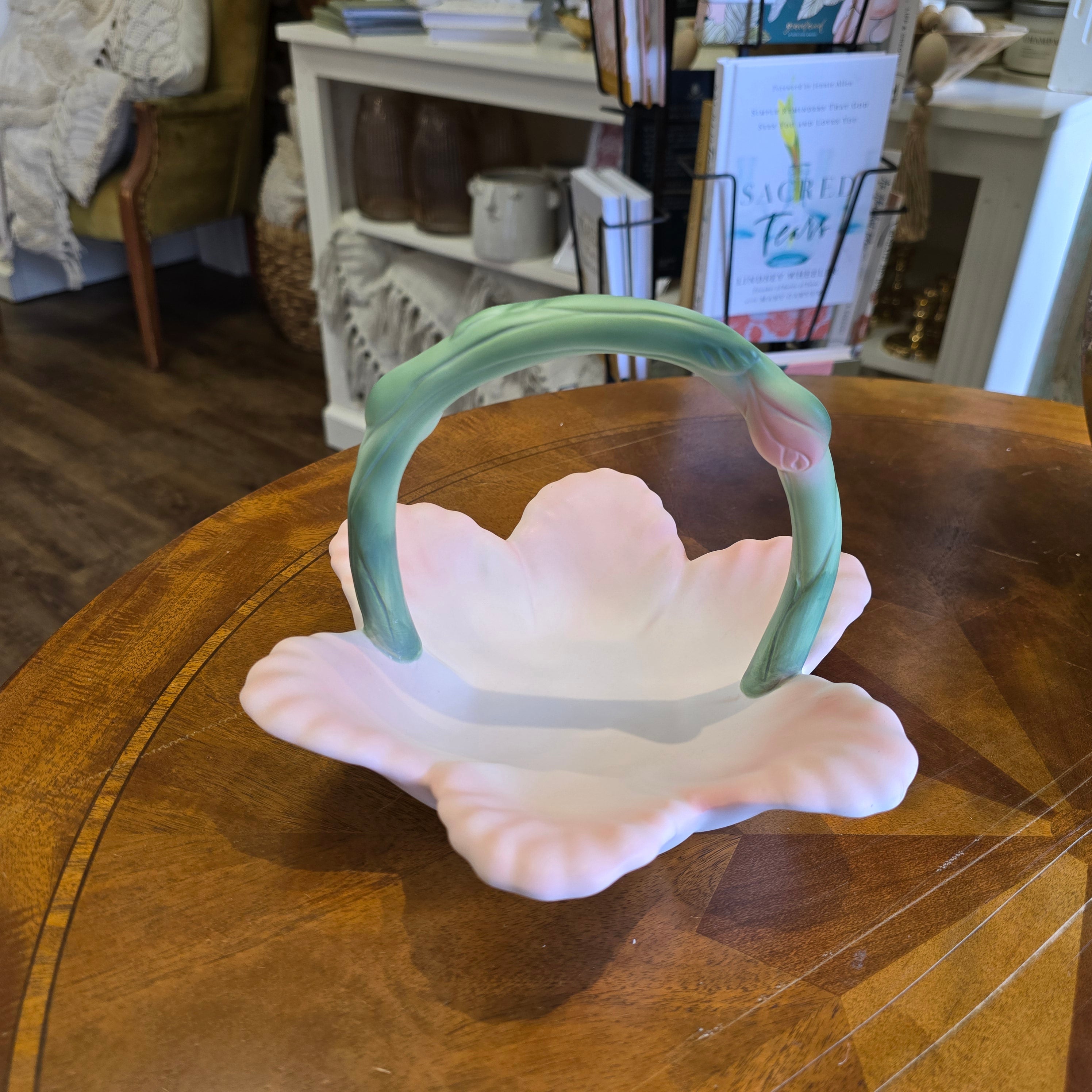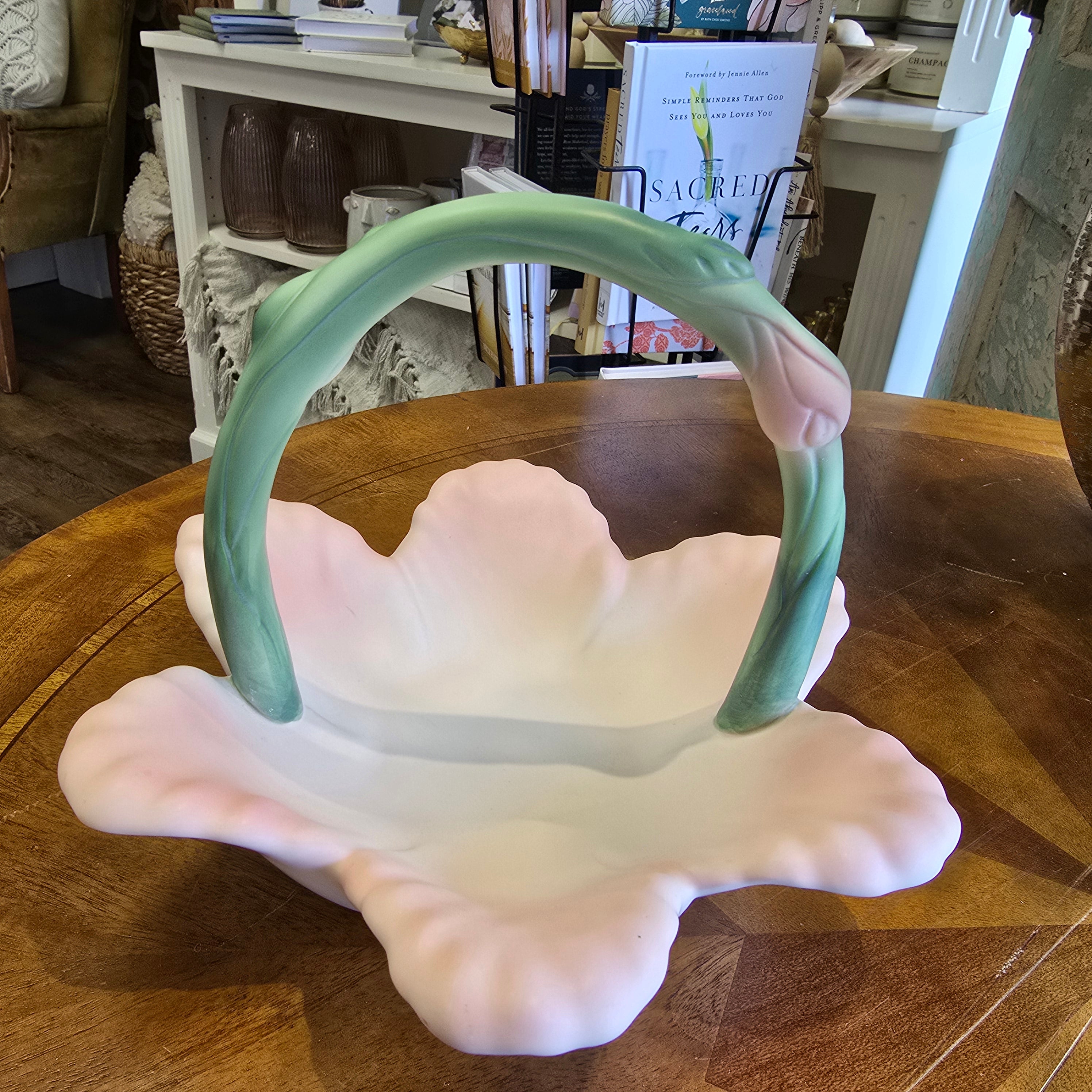 This beautiful ceramic flower bowl features a soft pink and green color combination and a matte glaze. Measuring 8.5 inches in length, 8 inches in width, and 6.5 inches in height, this basket was originally manufactured in Taiwan and is reminiscent of vintage Hull Pottery style. It is in pristine condition with no signs of damage such as chips or cracks.