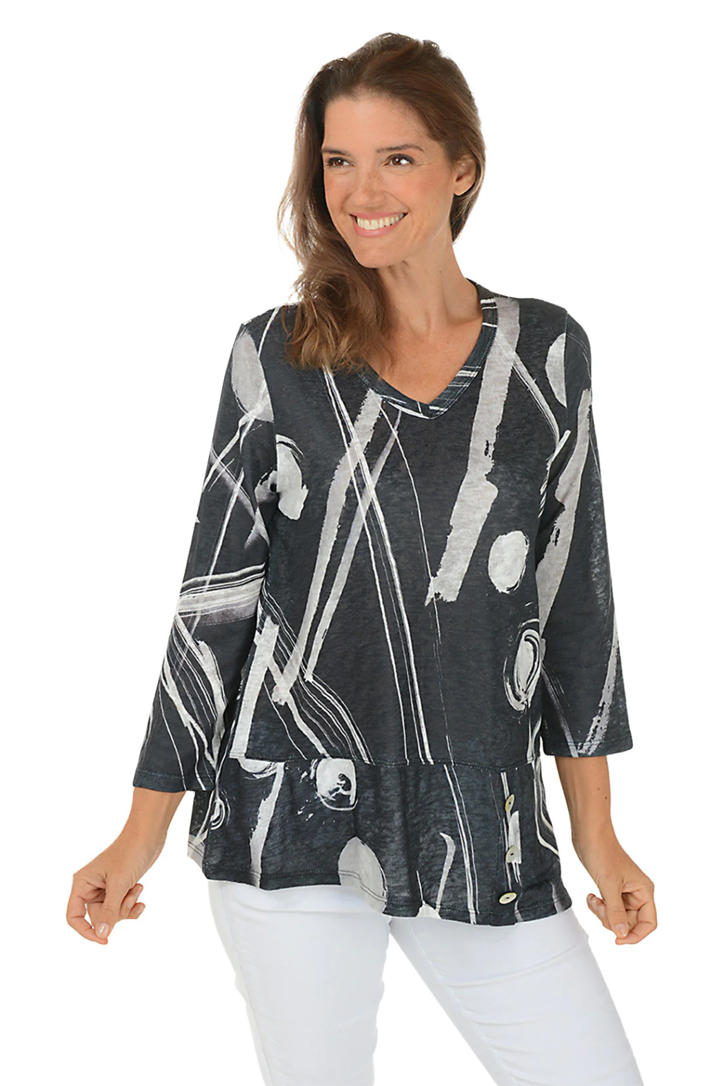 Elevate your resort ensemble with this v-neck knit top from Jess and Jane! Crafted from slub-knit fabric, this top features an asymmetrical hemline adorned with a trio of decorative buttons. The monochromatic brushstroke design adds a touch of modern sophistication, making it a versatile piece for day or evening outings.