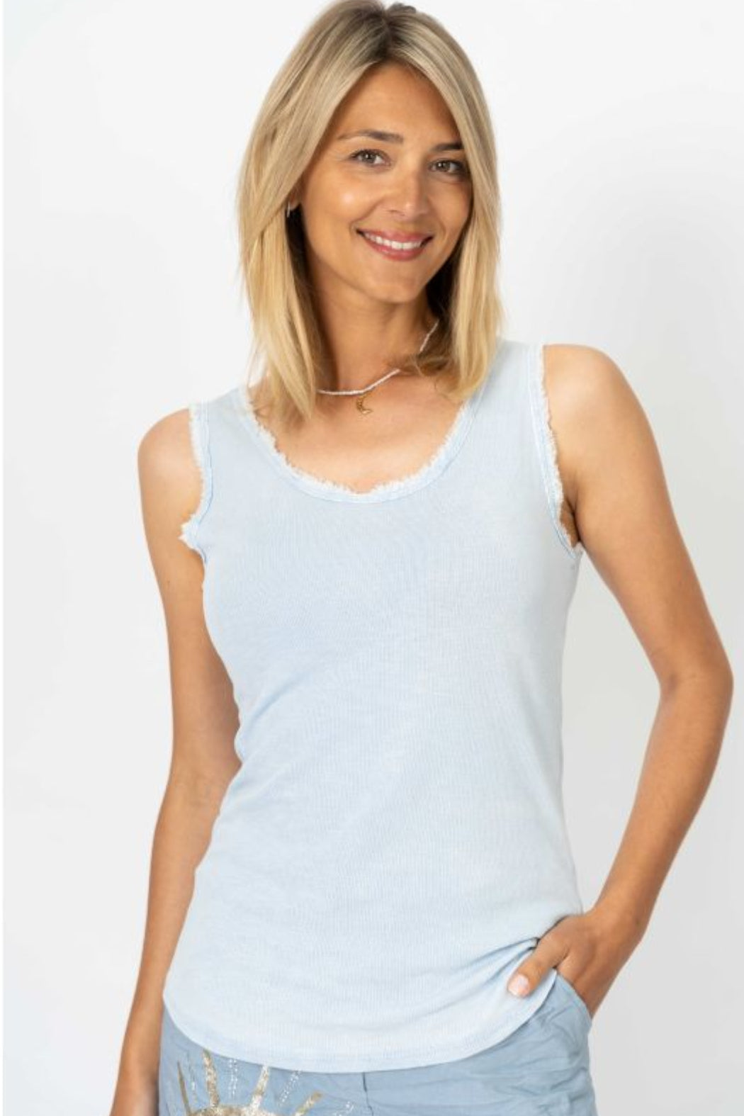 Cotton Tank raw edge. Round neck. Very soft and stretchy.