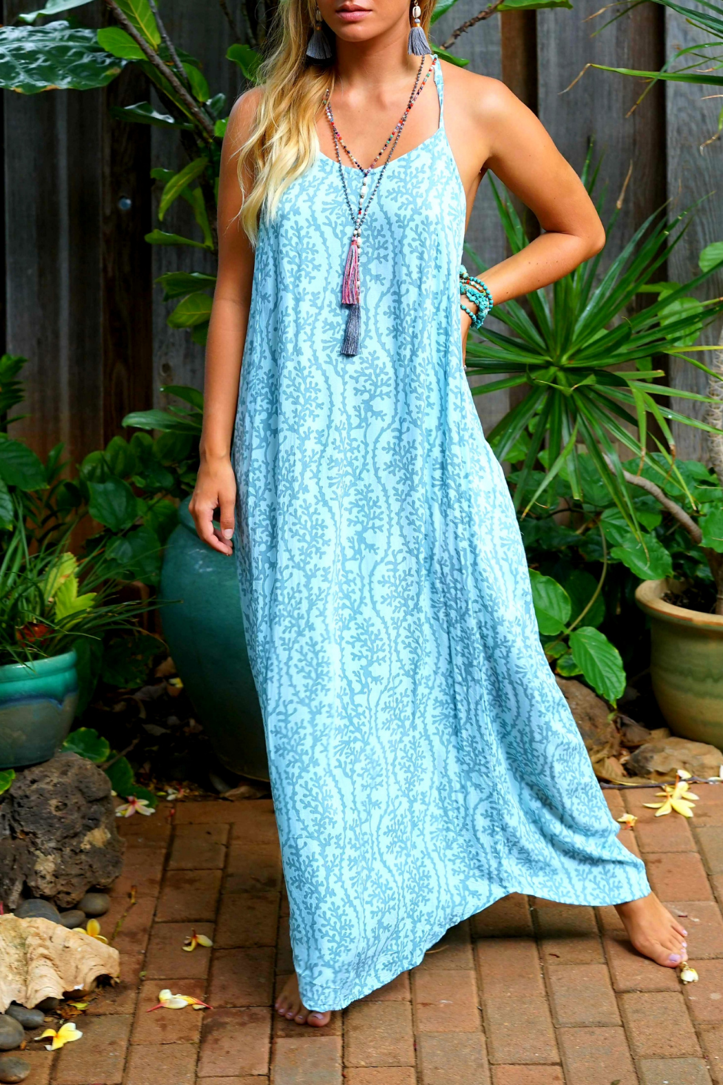 Designed in Hawaii by Lani Lau. The Wailea Sea Coral dress is the perfect maxi dress. One of our most popular prints! A flowy rayon racer back maxi dress with adjustable straps. Pair with your favorite sandals or just go barefoot!