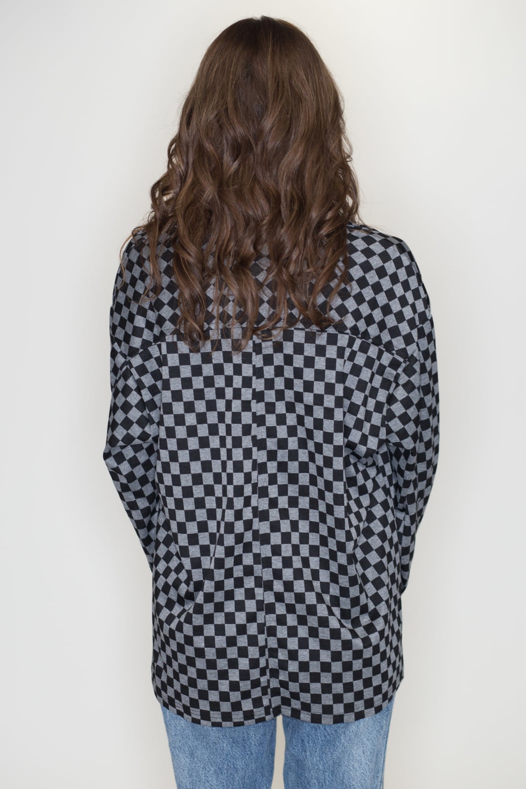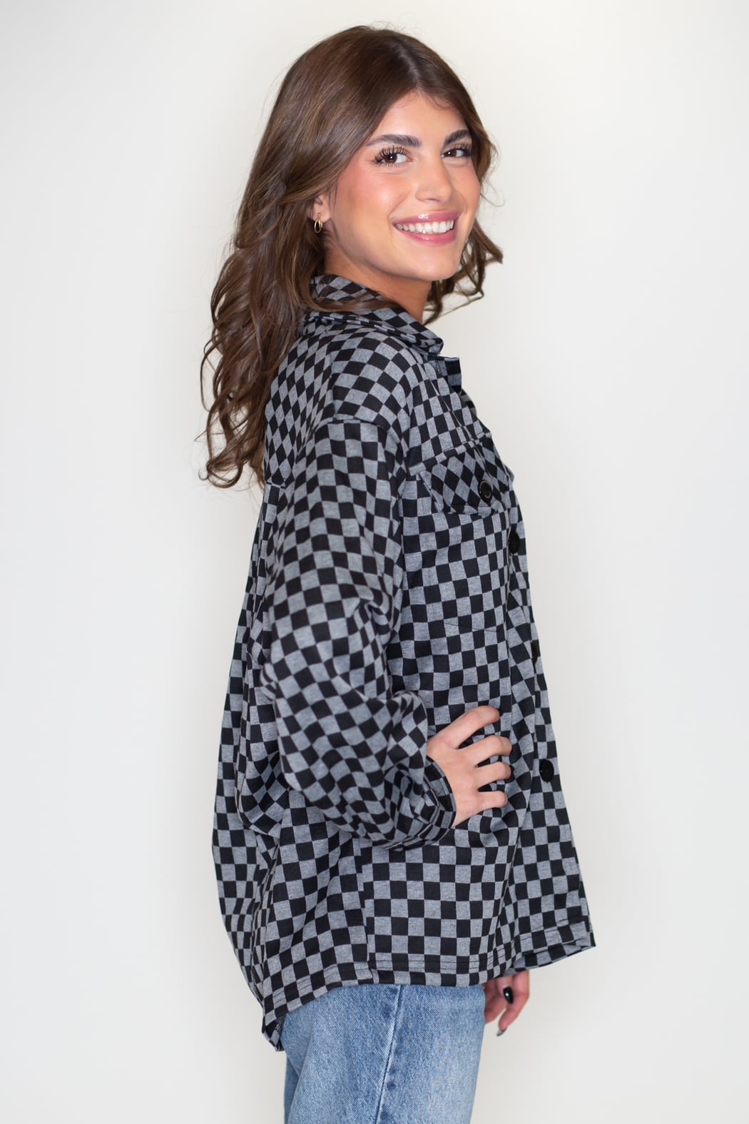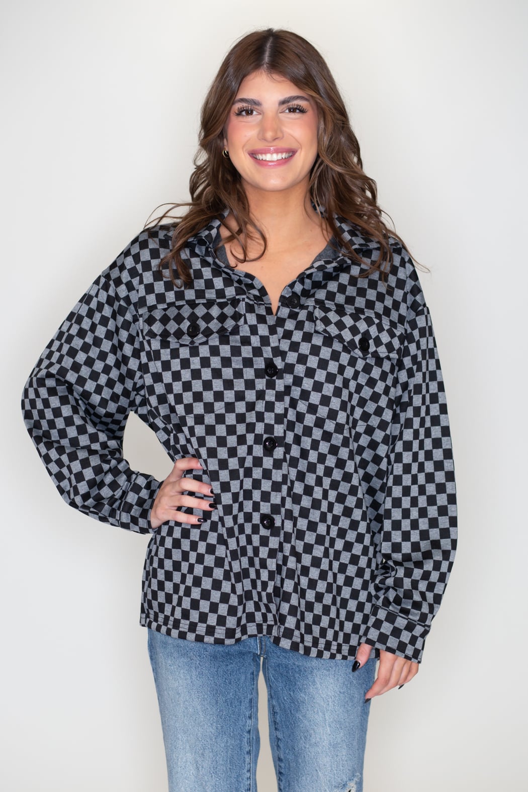 Patterned with eye-catching checkerboards on double knit fabric and front flap pockets, this shacket keeps you feeling warm with its collared neck, drop shoulders and long sleeves. Button-down closure allows for easy on and easy off.