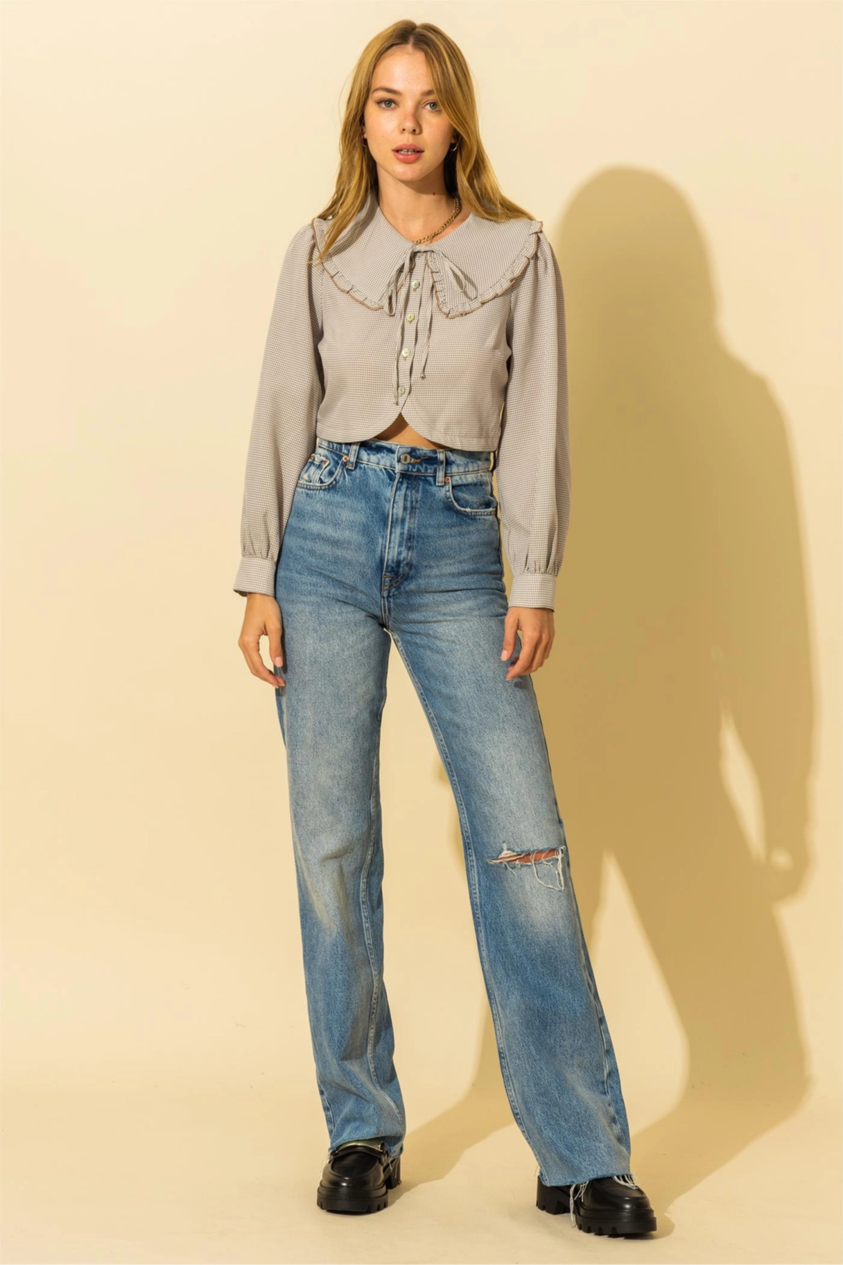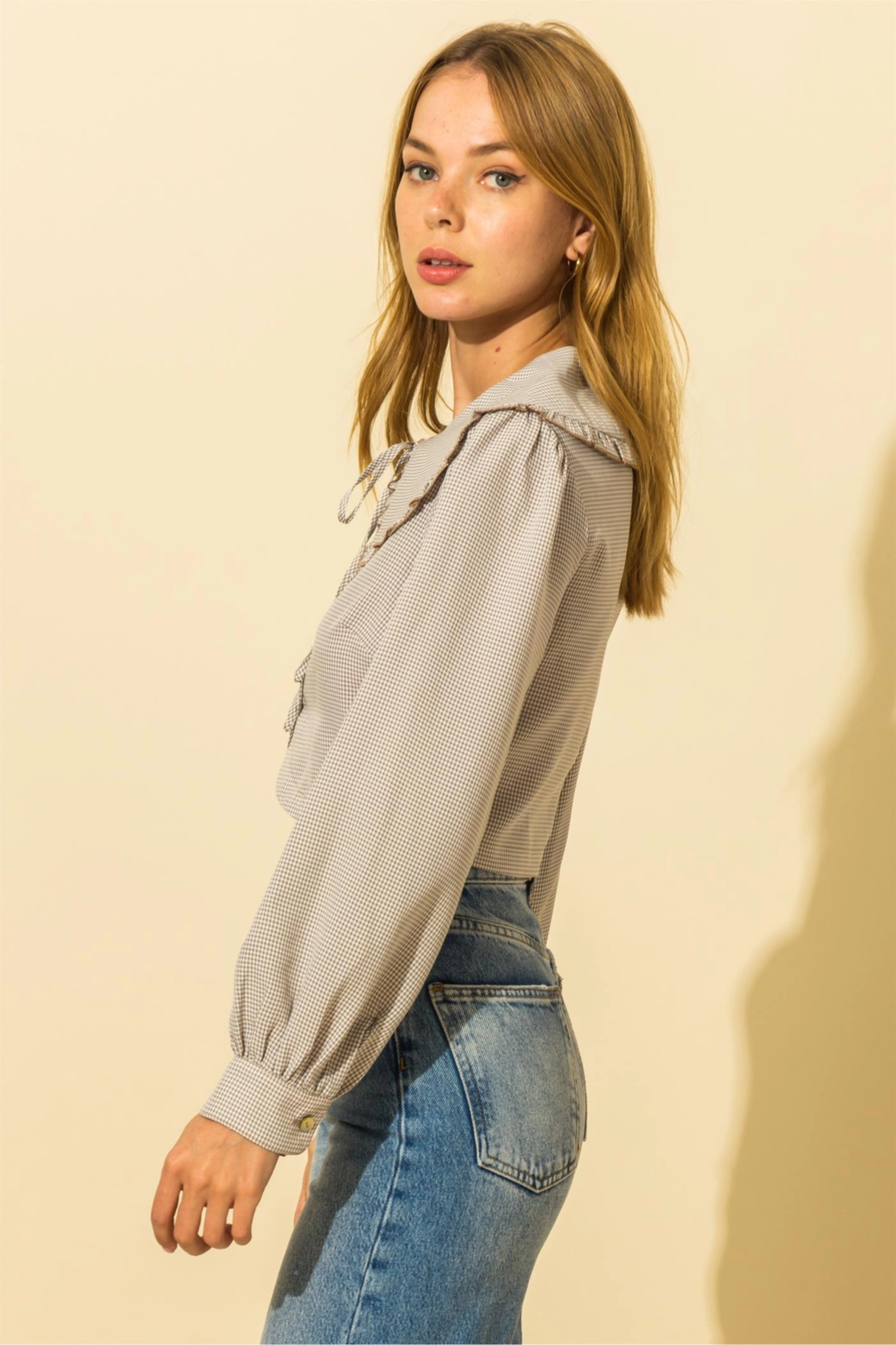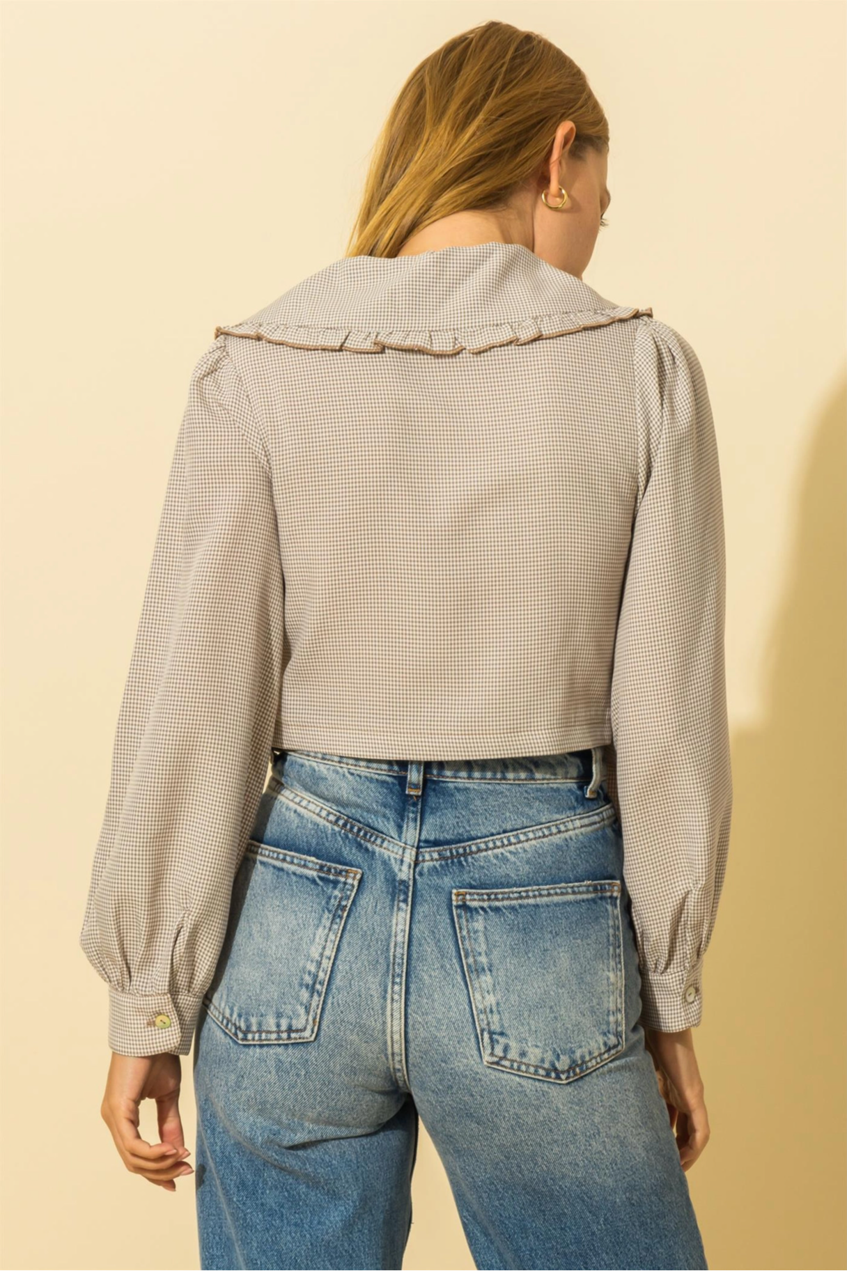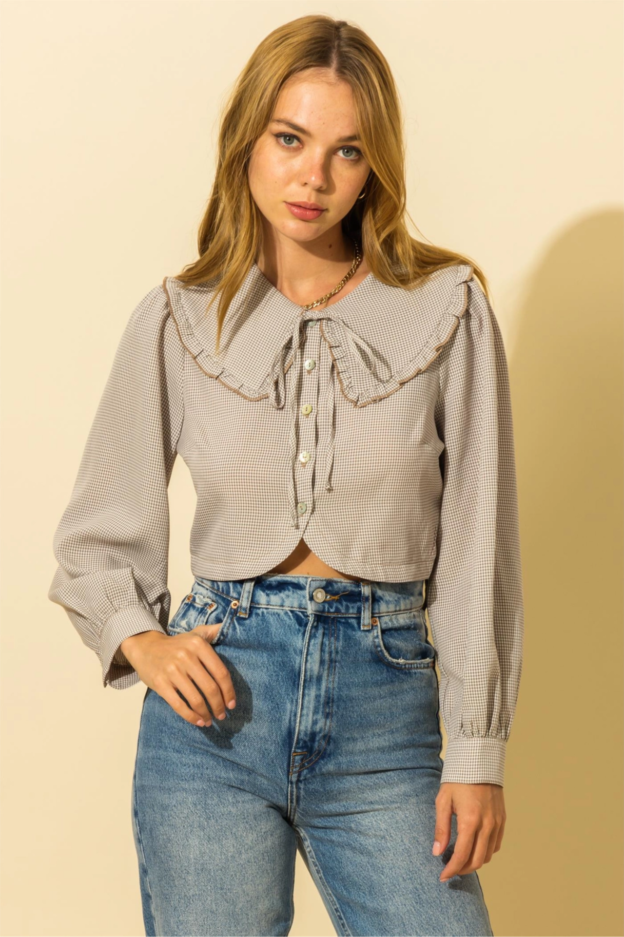 Ensure your casual look is on point with the down the ride peter-pan collar top. This unique style piece will add a nice touch to your casual wardrobe! It features frill trimmed puritan style Collar with a self tie detail, front buttons up placket closure, crop length, long balloon sleeves with with cuffs buttons closure, fitted bodice, brown and ivory mini checkered print all over, unlined, material has no stretch. Wear it this Fall with your favorite denim jeans, a mini or a long skirt! Also available in Black color. Model 5' 9" Tall 34C" Chest, 24" Waist and 35" Hips and wears size Small L: 34" B: 34" W: 29"