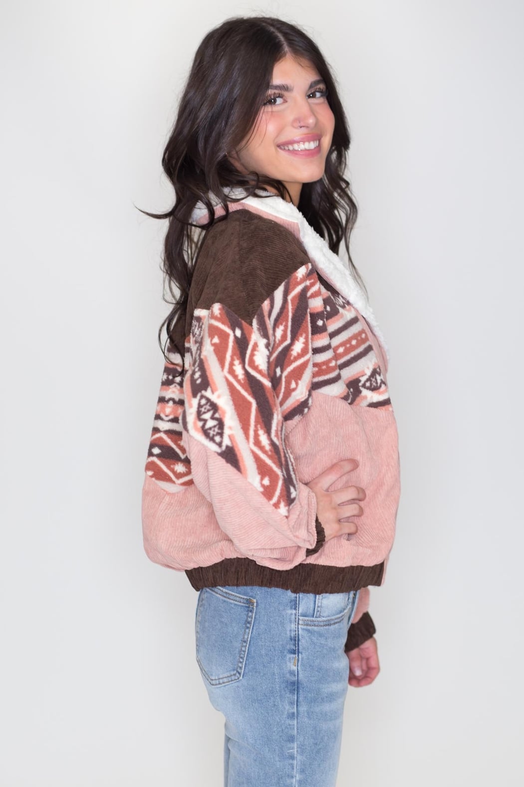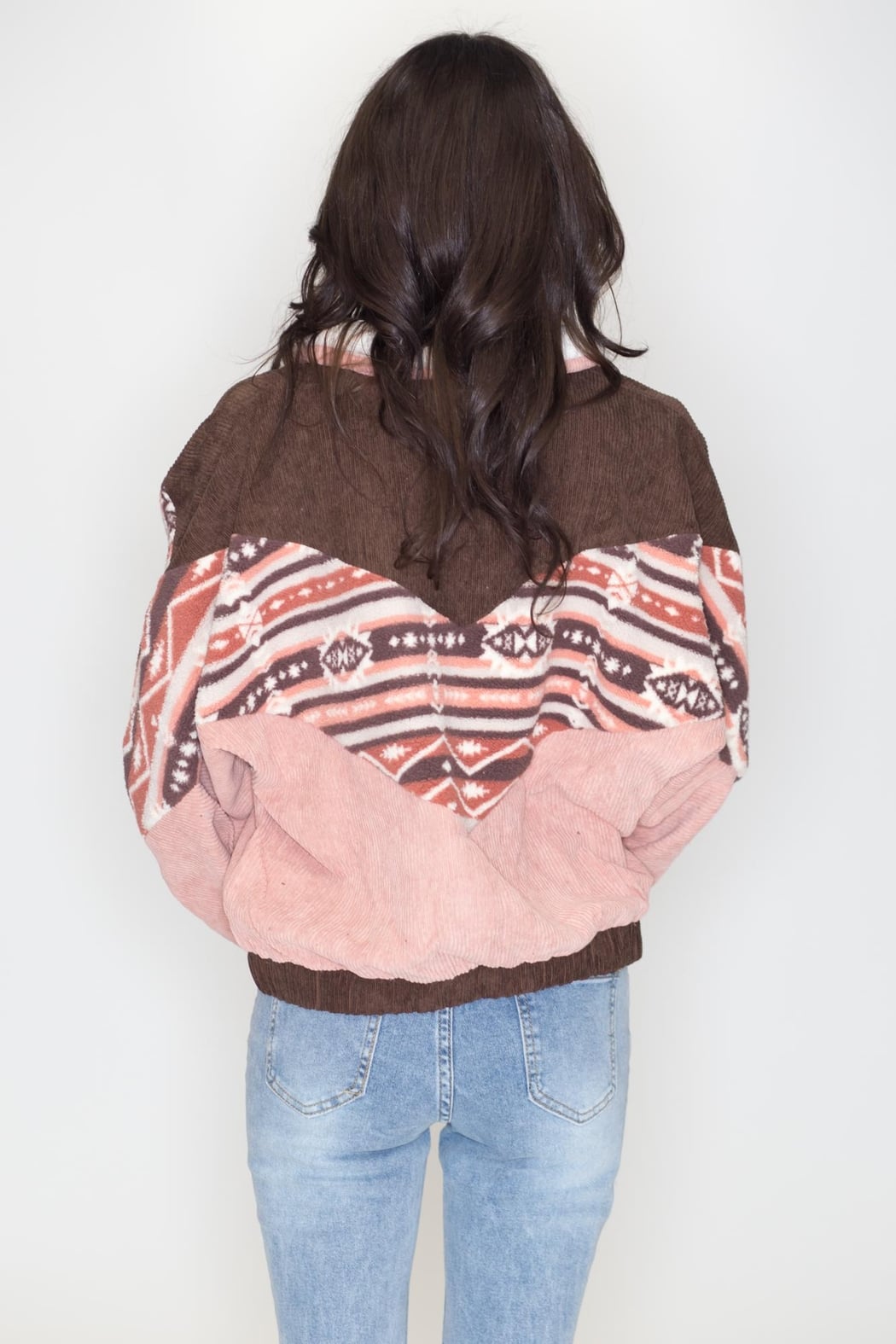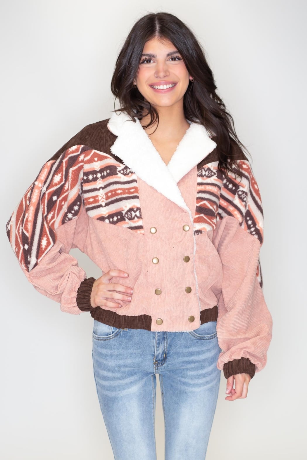 Designed with a combination of unique print and solid color, this jacket is adorned with a notched fur collar neckline and banded cuff sleeves. Oversized bodice keeps you feeling warm, designed with a double breasted button front detail.