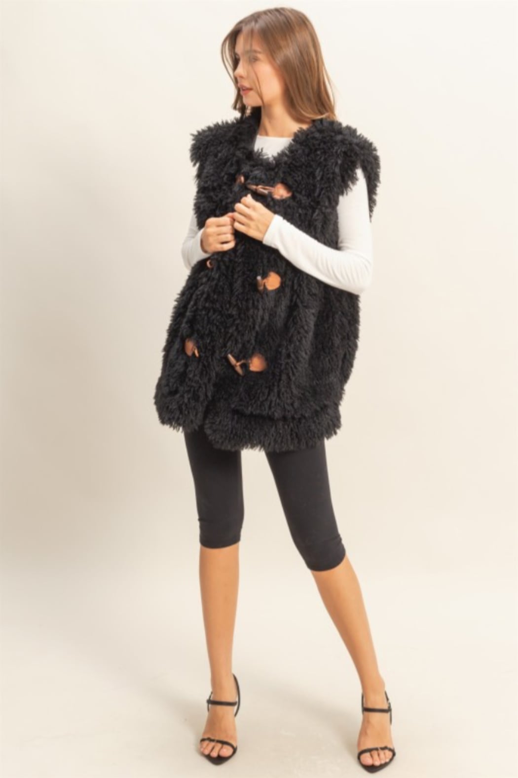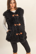 Cozy and textured, this Fuzzy Vest adds instant warmth and layer to outfits. This sleeveless vest features plush faux fur, side pockets and leather-look toggle closures for rustic detail. The vest is mid length that layers easily over tees and knits. Wear it as a statement outer layer for casual days or relaxed weekend looks.