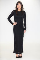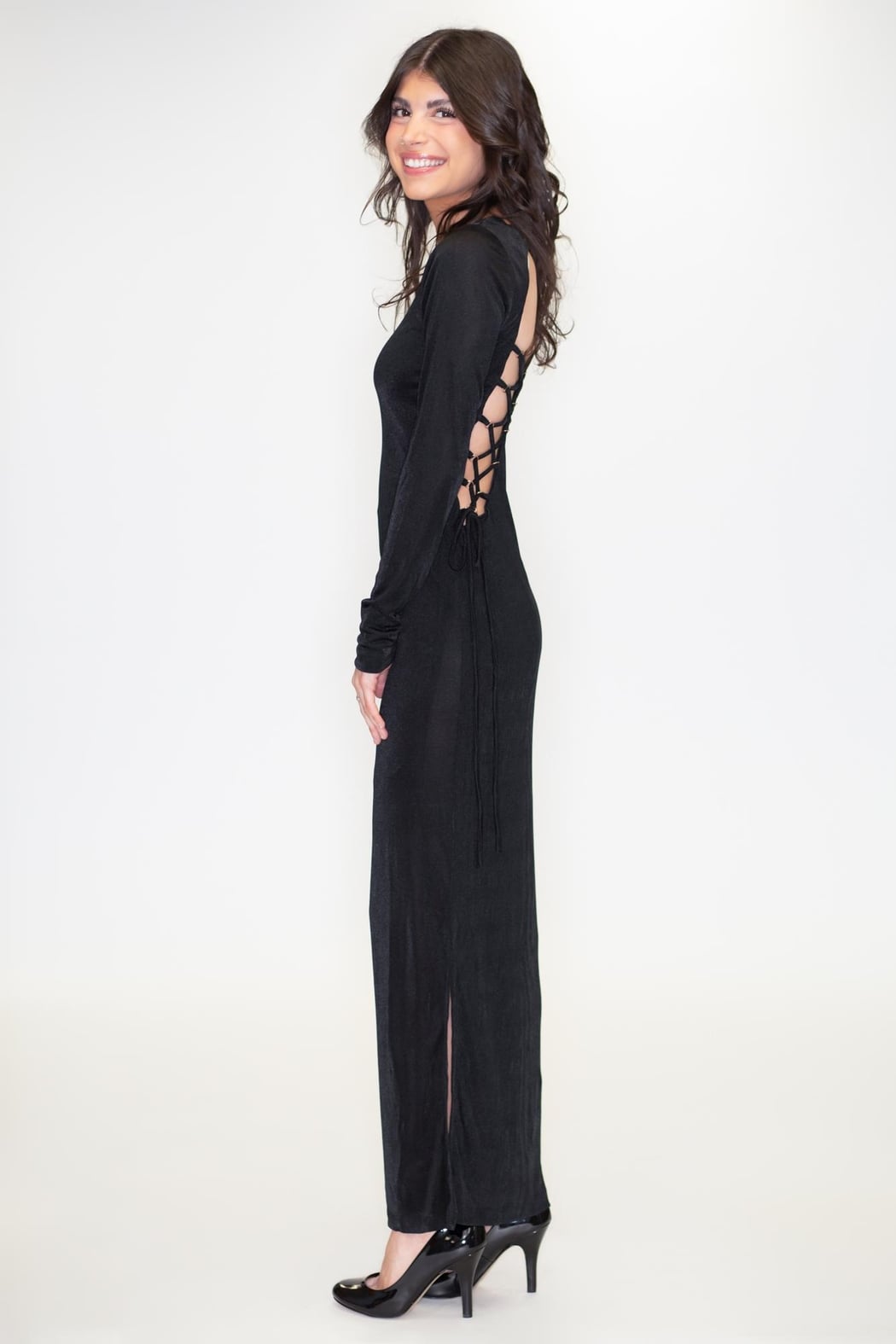 This captivating dress presents a round neckline with button closure, long fitted sleeves and a figure-flattering silhouette that allows you to flaunt your curves. A back cutout with asymmetrical lace-up detailing gives it an exquisite finish.