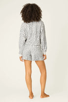 Get wild with your holiday lounging in this cream two-piece pajama set, designed in baby peachy waffle with a playful leopard print. The long-sleeve top and boxer shorts strike the perfect balance of cozy and cheeky.