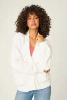 Snuggle into the holiday season with this ivory bouclé cardigan, soft and timeless with button closure and front pockets. A plush layer for curling up with cocoa, layering over pajamas, or holiday mornings at home.