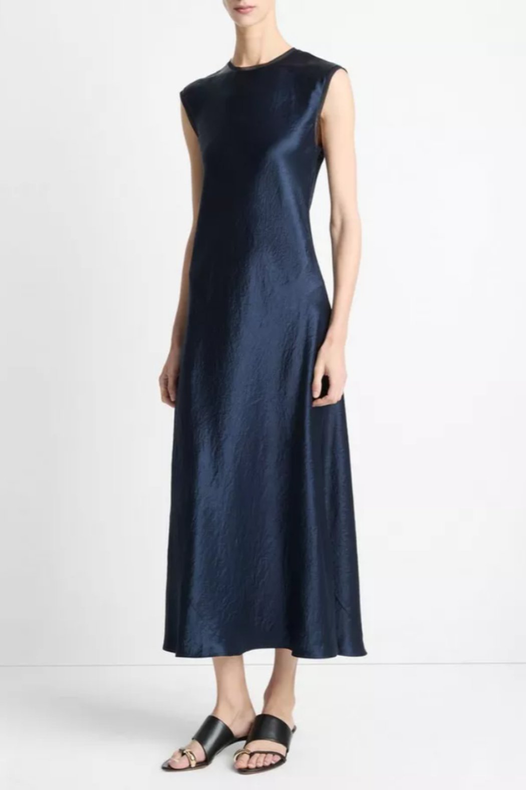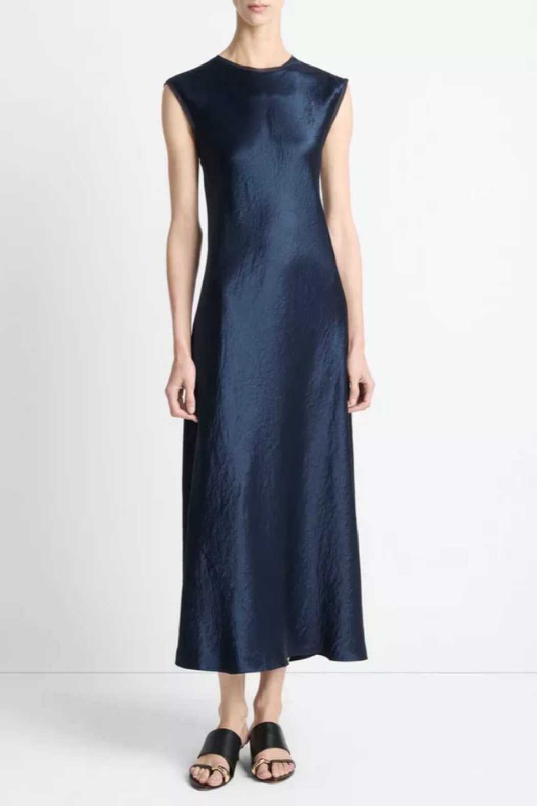 This cap-sleeve dress is cut on the bias so it falls fluidly down the form. It's crafted from our signature Japanese Naia™ acetate satin, a seasonless best-selling fabric for a reason — it's lustrous with a beautiful drape, lightweight and breathable, and is made using a bio-based, environmentally-friendly fiber. Be sure to zoom in on the collar and armholes, which we've finished with sheer picot chiffon trim.