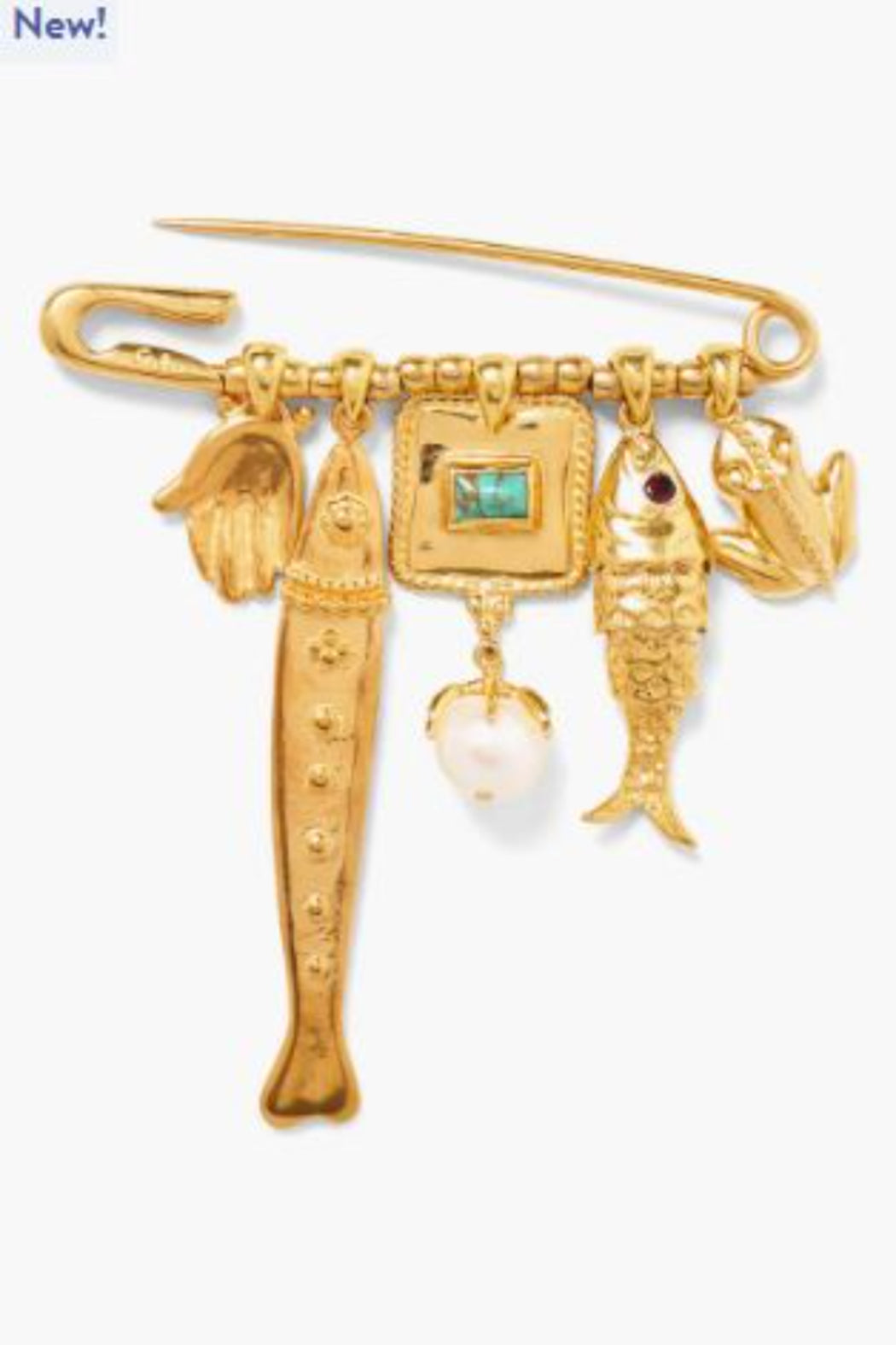 Originally inspired by punk subculture, this handcrafted safety-pin brooch takes a dip in mermaid waters with an eclectic mix of charms that include little fishies, semiprecious-stone accents and a pearl. Safety pin closure Pearl size: 8–8.5mm Sterling silver/freshwater pearl/quartz/blue topaz or sterling silver/18k-gold plate/turquoise/garnet/freshwater pearl Handmade in Vietnam Item #11070111