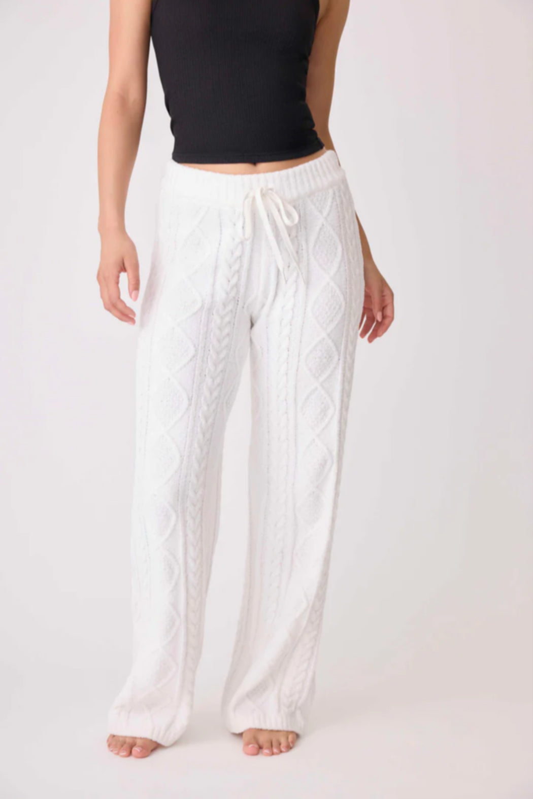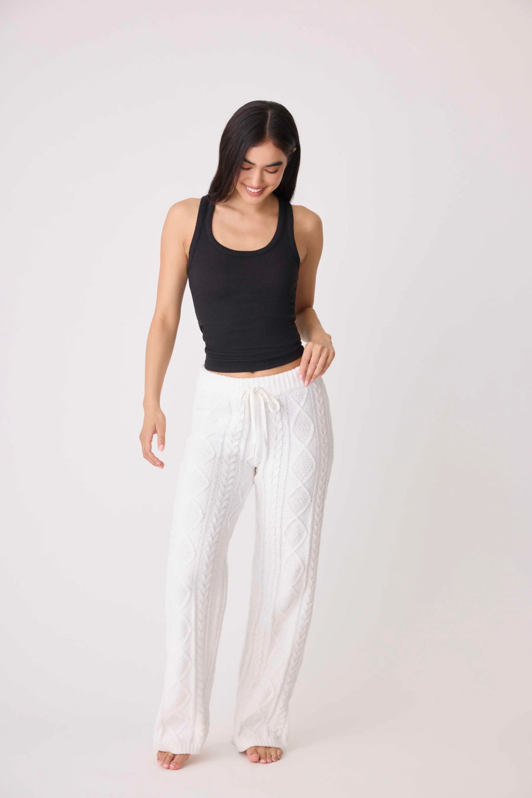 Laid-back and plush, these chenille lounge pants are made for slow mornings and cozy nights. The creamy off-white knit has a classic cable pattern and velvety-soft feel you’ll never want to take off. An easy drawstring waist and open-leg silhouette make them perfect for pairing with the matching top or your favorite oversized sweater. 100% Poly Washable Imported