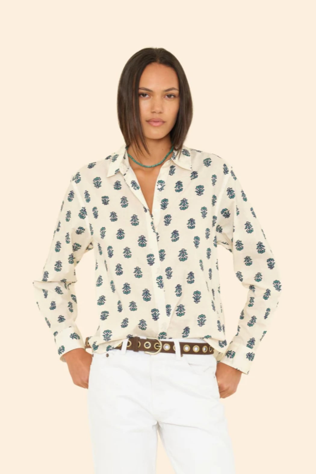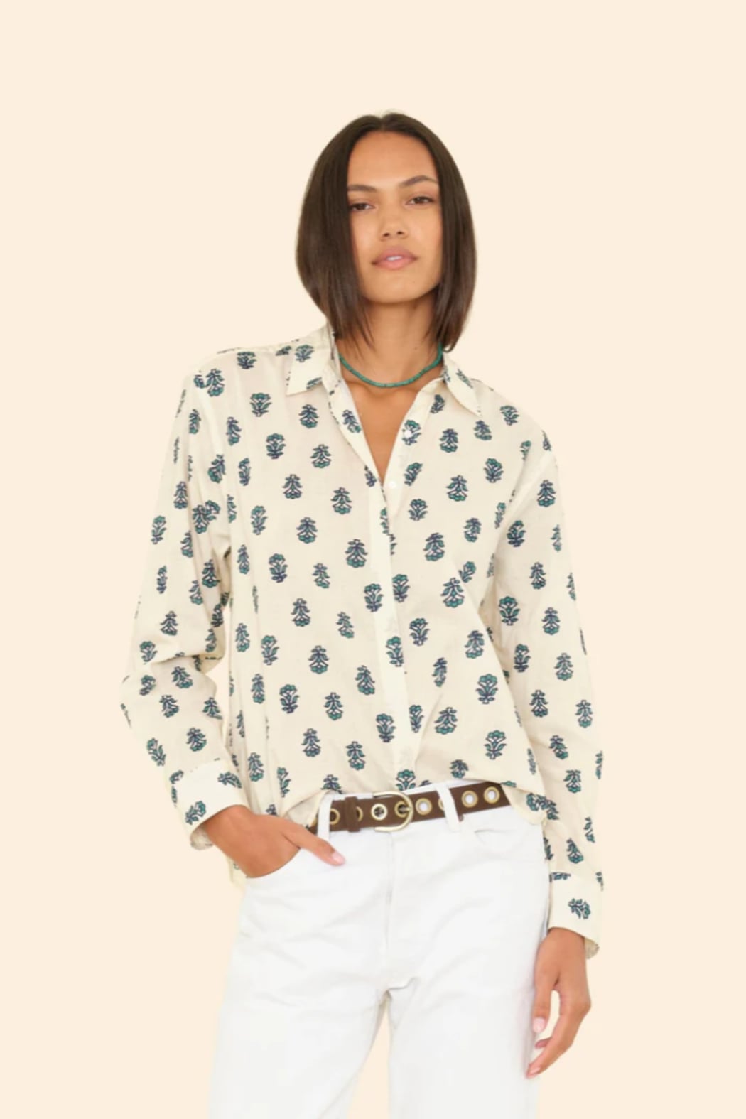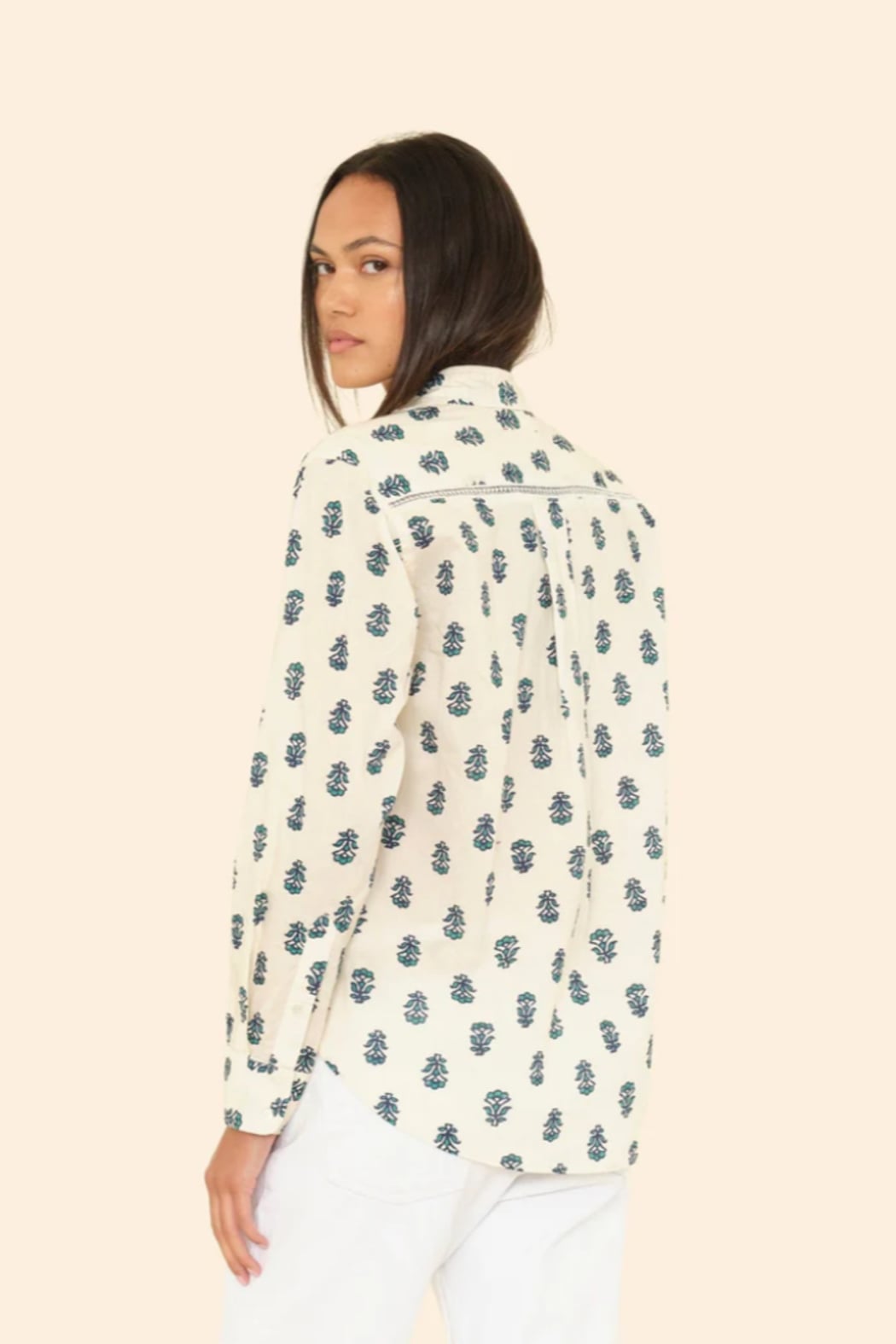 Flower Power. Emmie is new this season in our lightweight paisley print cotton lawn. This button-front shirt features a box pleated back yoke and lattice trim details.