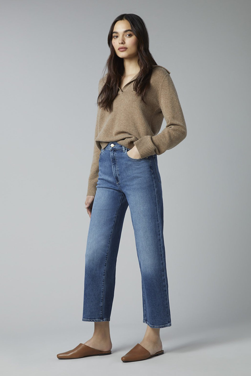 Hepburn is a vintage high-rise that is fitted through the waist and seat, tapering outward from the thigh for a wide leg that hits above the ankle.