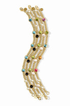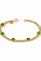 The Dolce Delicate Bracelet - Palmetto Green from Julie Vos features a fine double chain and lobster-claw closure for adjustable wear. Lightweight and refined, it layers beautifully with both casual and dressy looks. Hand-finished details lend it a boutique, artisanal feel. This one is all Iridescent Palmetto Green semi precious stones. 24K gold plate, imported glass Length: 6 / 6.8 / 7.5 inches (adjustable) Width: 0.3 inches Closes with lobster clasp Julie Vos hallmark