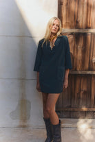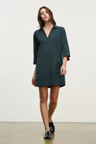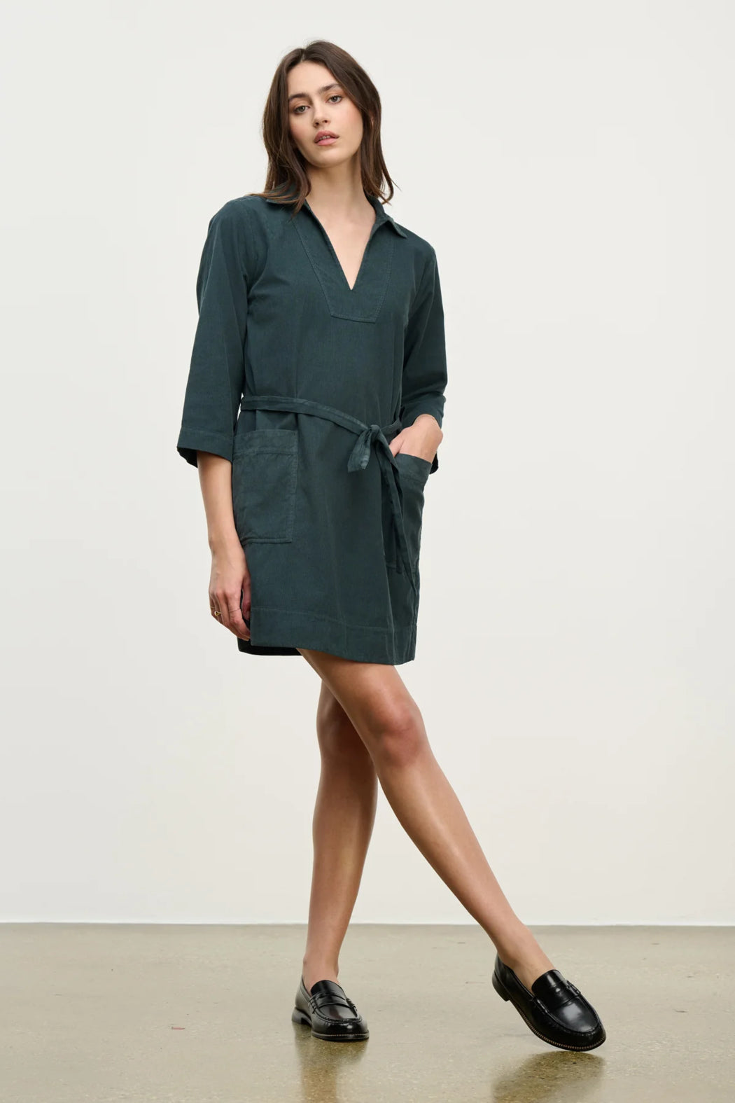 Effortlessly chic, this mini dress is crafted from soft cotton corduroy and features a classic collar, flattering V-neckline, and 3/4 sleeves. Two front patch pockets and a pinch pleat at the rear add thoughtful detail, while a detachable belt lets you define your silhouette. A comfortable and stylish choice for everyday wear.