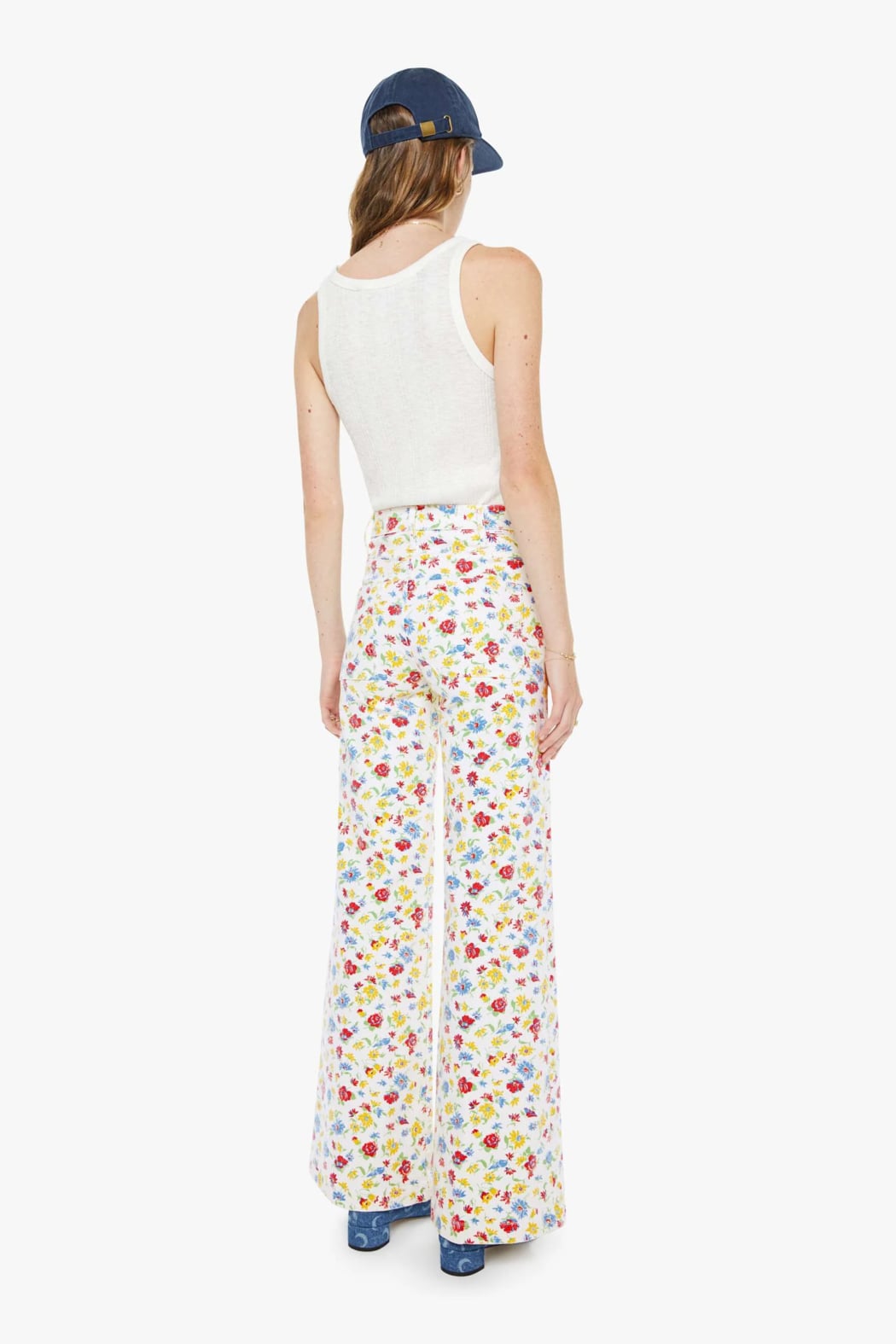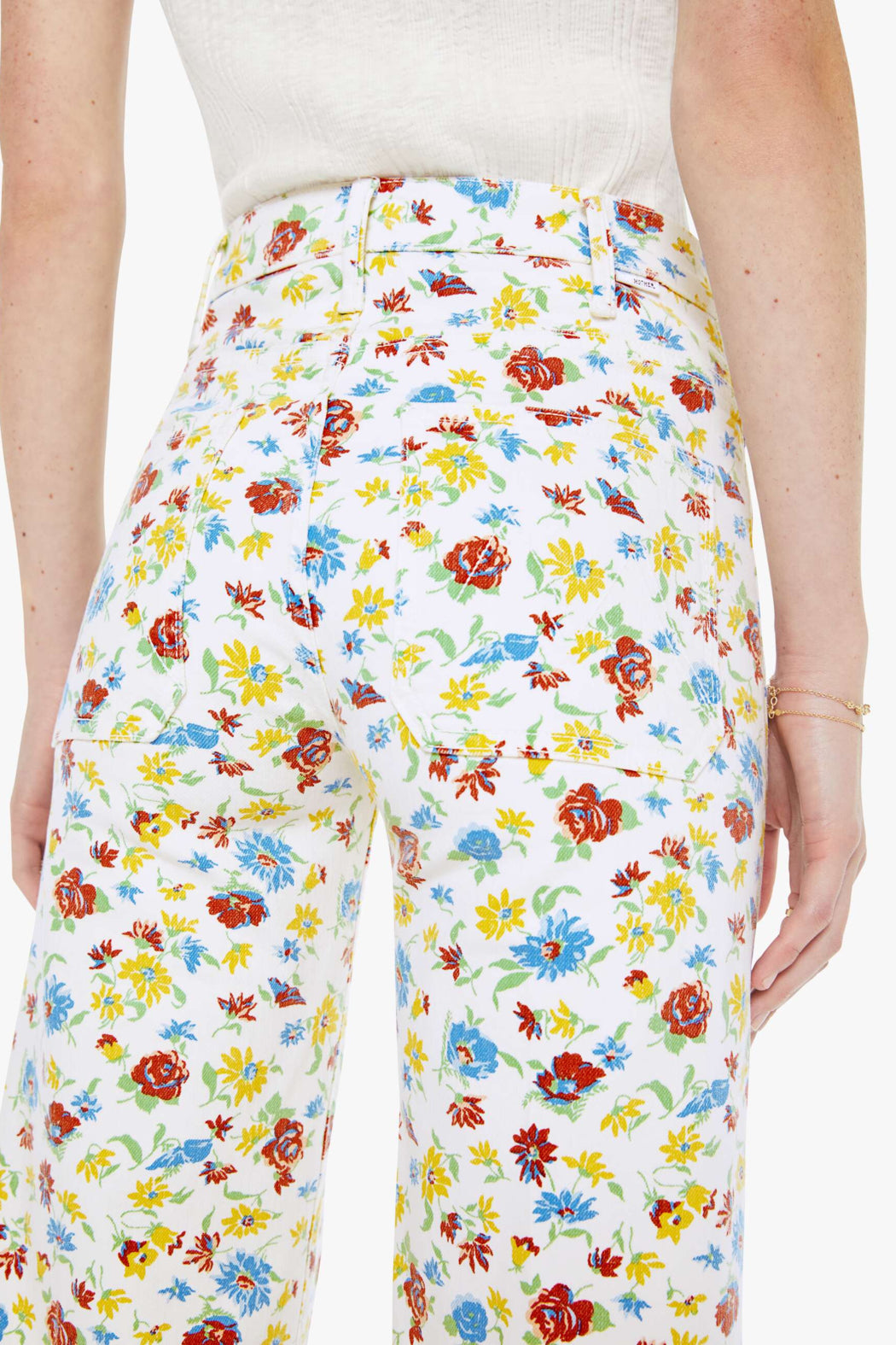 70s-inspired wide leg jeans with a high rise, zip fly, patch pockets, 32-inch inseam and clean hem. Made from stretch denim, Rose Bowl is a bright white with a colorful floral print.