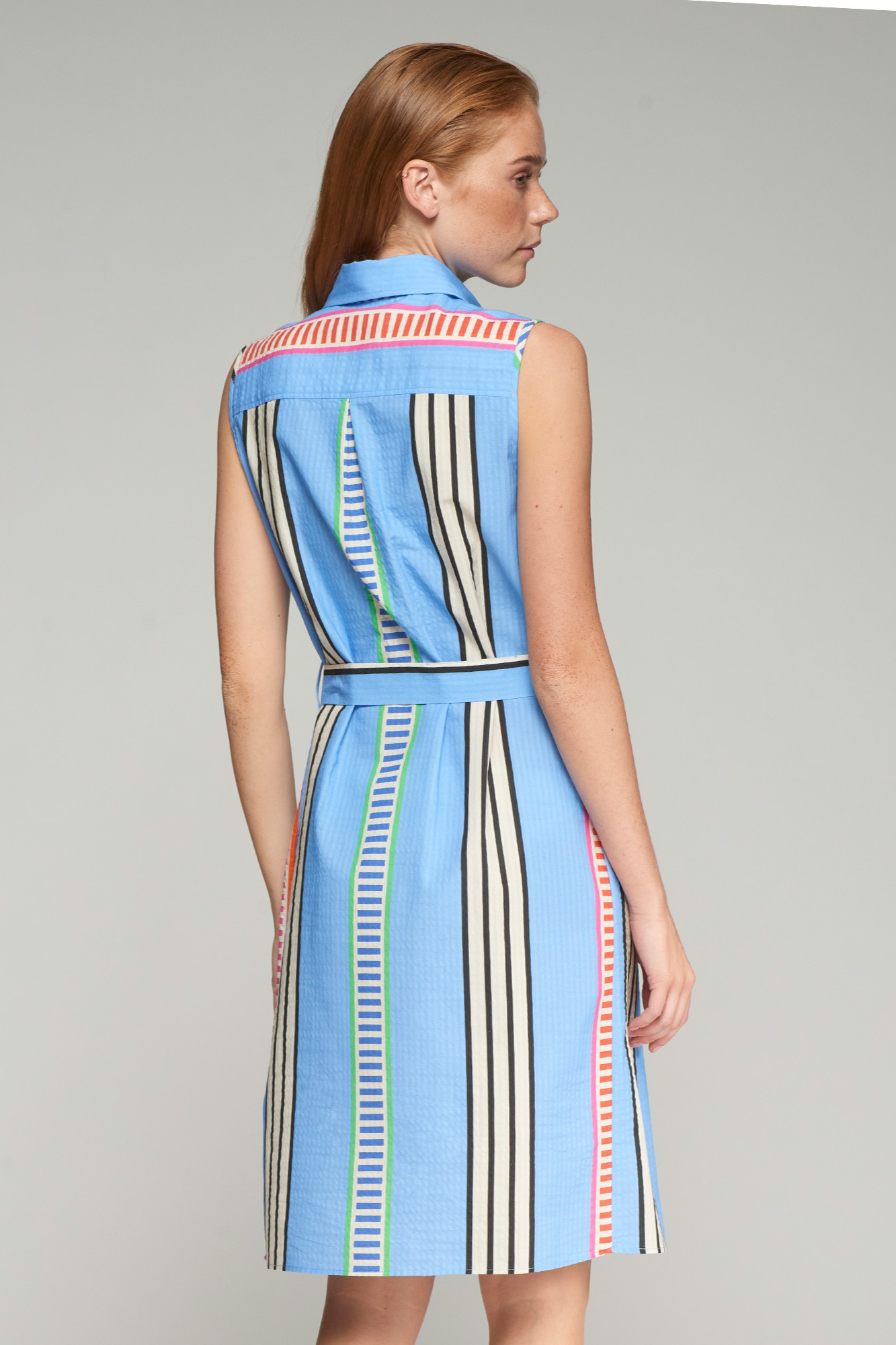 Short blue dress with colored stripes with different designs. Front closure with shirt buttons. Shirt collar. Sleeveless. Removable belt. The model is 1.74 cm tall and wears size 38.